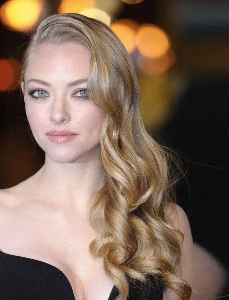Волны гламура, иногда называемые волнами серфера, – это волосы, специально завитые бигуди. Такие волосы поднимаются и придают объем лицу. Аманда Сейфрид использует еще один трюк – актриса делает пробор посередине головы, что удлиняет лицо и делает его круглым.