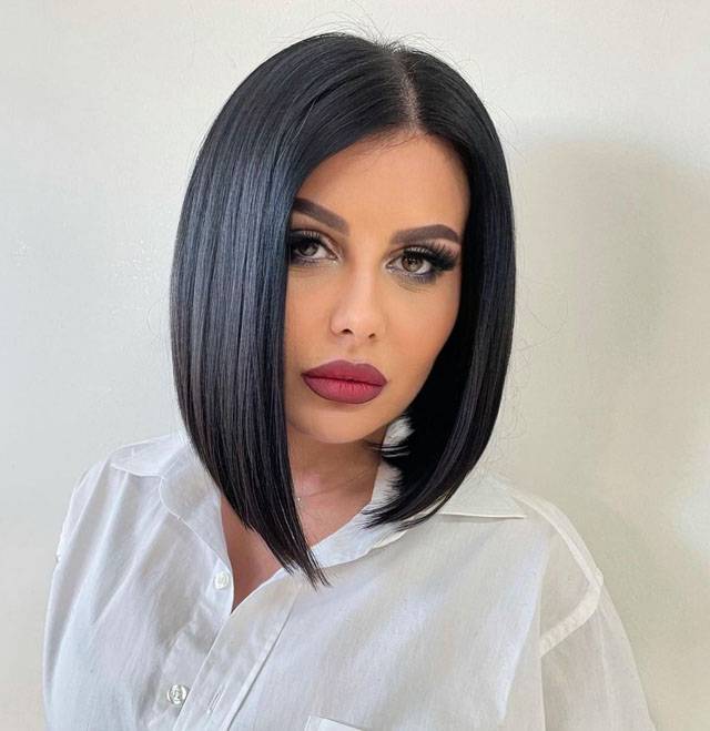 Более длинная асимметричная сторона доходит до подбородка, создавая еще больший контраст с другой более короткой стороной.