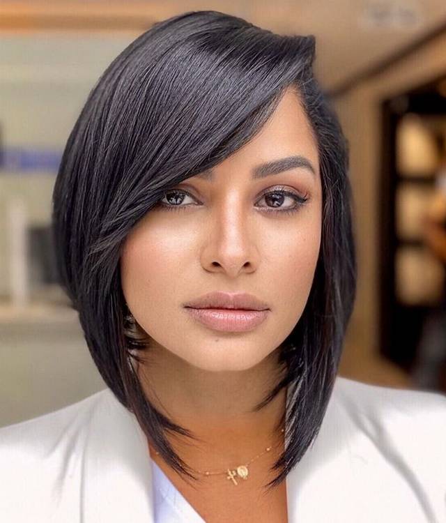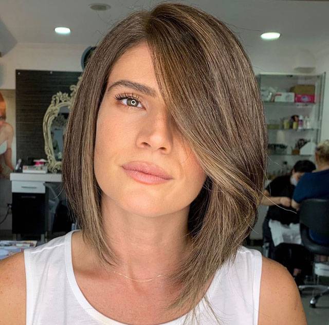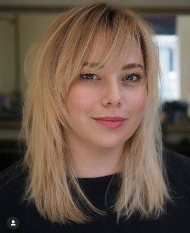 Длинная челка, зачесанная набок, может помочь сбалансировать круглое лицо, добавив длину и сделав лицо стройнее.