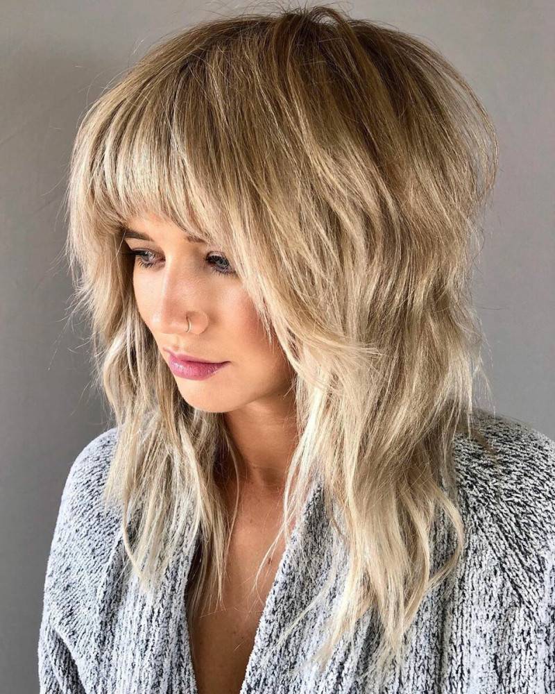 - Стрижка волка. Такой формат прически подойдет женщинам с длинной шеей. Ниспадающие пряди и густая ярусная челка придают лицу игривость. Несмотря на кажущийся агрессивный формат, такая укладка позволяет подчеркнуть женственность и скрыть морщинки на лбу.
