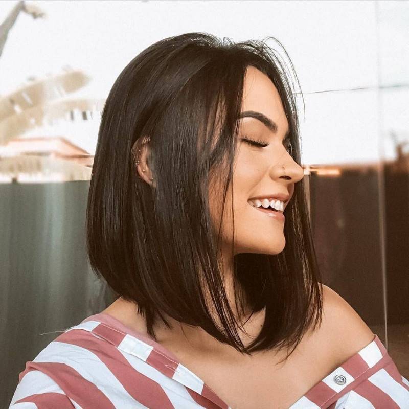 Косая челка в 2022 году не сдаёт свои позиции в топе причесок. Выглядеть ярче и необычней можно при окрашивании определенных волосков. Прямая челка до линии бровей внесет таинственность и романтичность. Средний боб выгодно работает при достаточной густоте и объеме шевелюры. Финансовые потери при уходе минимальные. Градуировка внесет невесомость и объем прядям.