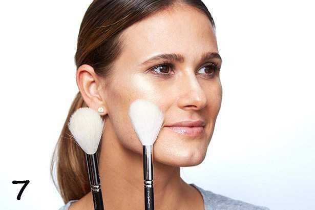 Первым делом нанесите крем-иллюминайзер (хайлайтер) на верхнюю часть скул и основательно растушуйте его кистью для макияжа, как показано на фото выше.