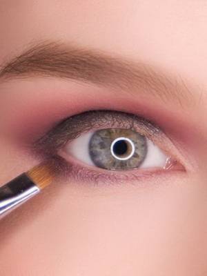 - Уголки глаз выделяются более тёмными оттенками: серыми, коричневыми, тёмно-изумрудными, хаки. Мягкой кистью тени наносятся на внешние уголки, прорисовывается линия по верхнему краю, но не доводится до брови. Границы растушёвываются.