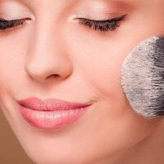 - Макияж почти готов, осталось подкорректировать образ с помощью пудры и румян. Сначала наносятся румяна на скулы. После этого небольшими штрихами, туда, где может появиться жирный блеск (лоб, крылья носа и подбородок), наносится пудра.