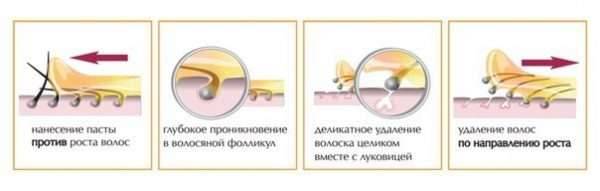 Очень важно правильно удалить пасту. Сделайте это одним энергичным движением по росту волос. Медленное снятие или неправильное направление могут грозить врастанием волос после процедуры