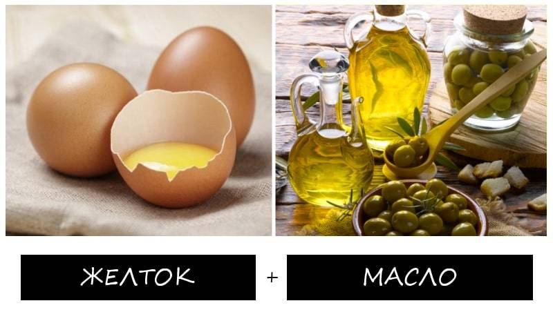 - 1-2 желтка + 2-3 ст. л. жидкого кокосового масла + 3 капсулы препарата Аевит + 2 ч. л. меда.