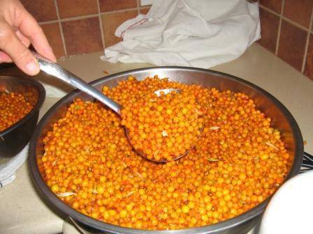 Для приготовления 100% масла из облепихи следует пропустить через соковыжималку спелые промытые и высушенные плоды растения. Получившийся сок сливают в низкую и широкую посуду, а затем помещают на 24 часа в темное место. По прошествии этого времени масло соберется на поверхности жидкости, именно его следует легонько снять ложкой в отдельную ёмкость и хранить в холодильнике. А вот спешить избавиться от оставшегося сырья после сбора жирных кислот не стоит. Сок можно оставить для приготовления витаминизированных напитков, а просушенный жмых можно заваривать как чай.