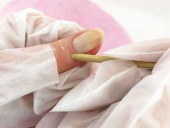 Спустя несколько минут после нанесения препарата, омертвевшие клетки удаляются специальной палочкой или кусочком пемзы. Лучше всего использовать профессиональную апельсиновую палочку или палочку из дерева самшита. Кожица вокруг ногтя очень аккуратно и легко отодвигается.