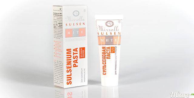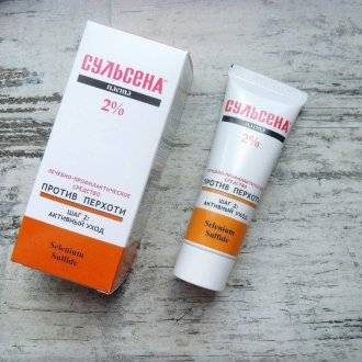 Паста сульсена 1%. Благодаря содержанию 1% сернистого соединения SeS2 (дисульфида селена) и комплексу полезных добавок паста является эффективным профилактическим средством от избыточного выделения кожного сала, появления перхоти и неприятного зуда, образования экзогенных токсинов, разрушающих корневой аппарат волос; улучшает жизнедеятельность волосяных луковиц, повышает тонус волос и предотвращает деструктивные процессы в зоне роста волосяного покрова. Способствует оздоровлению клеток кожи волосистой части головы, придает волосам здоровый вид.