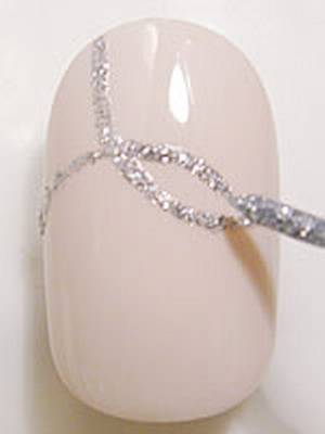 При помощи пинцета захватить жемчужное ожерелье и установить его на влажном лаке, чтобы оно скрыло границу. Для лучшего закрепления прижать ожерелье к ногтю. Лишнее ожерелье откусить щипчиками.