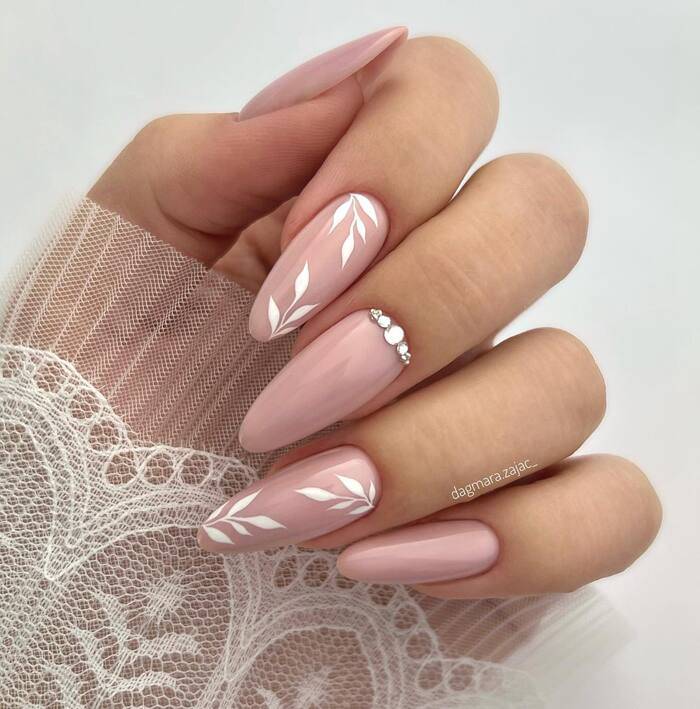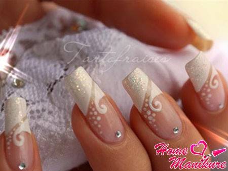 Подбирая варианты свадебного маникюра, стоит обратить внимание на сдержанные и мягкие оттенки, которые прекрасно впишутся в нежный свадебный образ. Изюминку вашим ногтям добавят стразы, декоративные камушки и изящные рисунки