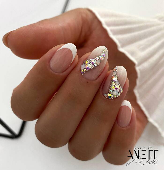 Для невест, которые хотят добавить гламура и дороговизны своему образу, маникюр с украшениями из стразов и глиттера – идеальный выбор. Можно создать изящные узоры из страз или нанести глиттерное покрытие на один или несколько ногтей. Это добавит вашему образу дополнительную роскошь и сияние.