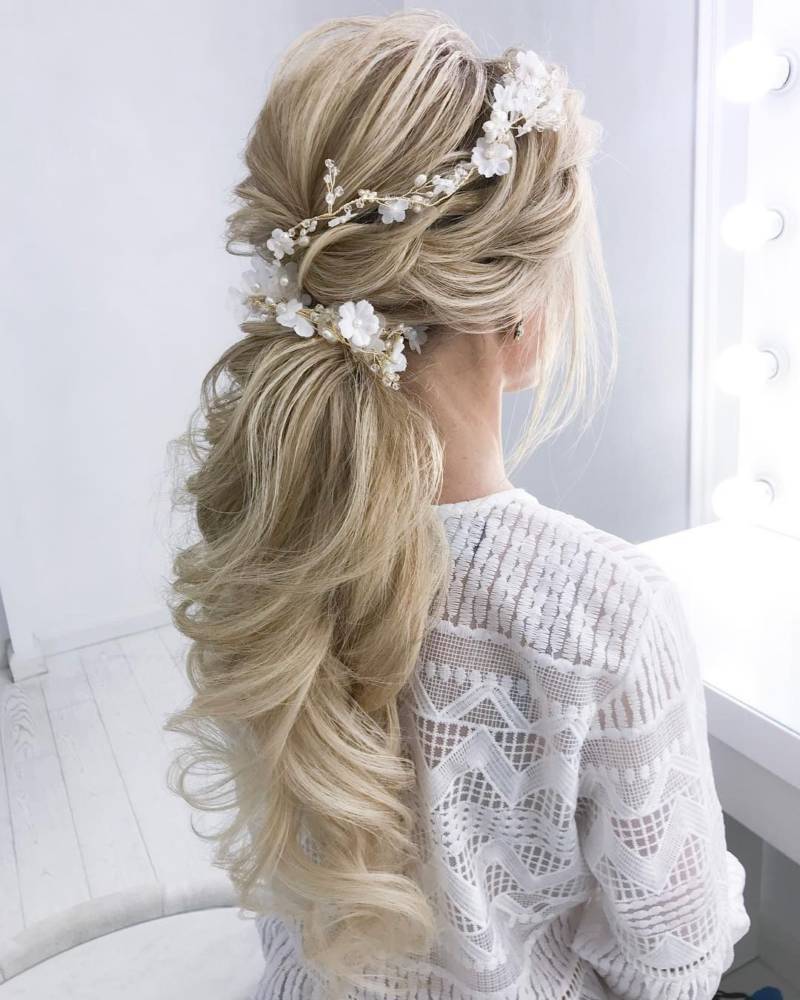 Другая идея для свадьбы — конский хвост. Если его украсить бусами из жемчуга или ажурной тесёмкой, получится интересное «сооружение из волос» в духе принцесс из мультфильмов.