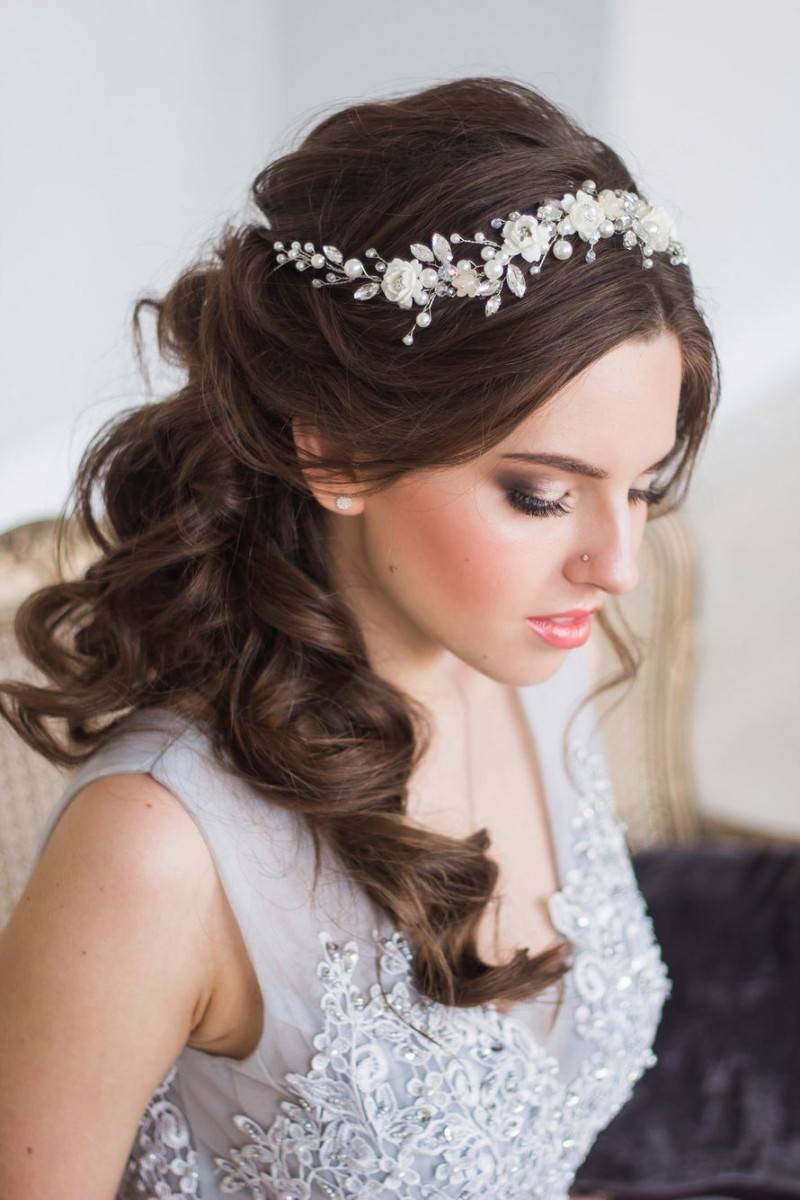 - Прически с легкими и воздушными локонами. Естественная красота распущенных волос – излюбленный выбор голливудских звезд. Подчеркнуть великолепие невесты помогут уложенные на одну сторону локоны или волосы, небрежно собранные на затылке. Можно использовать разнообразные аксессуары: обручи, заколки, диадемы и др.