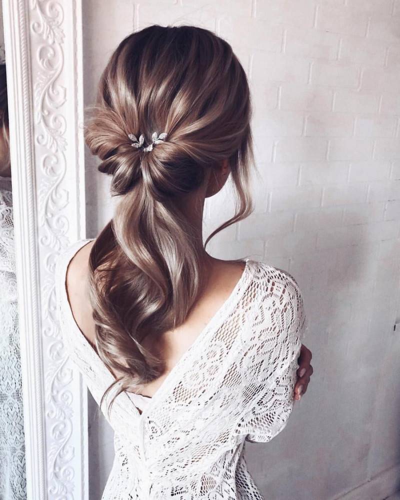 - Конский хвост подчеркнет элегантный вкус невесты. Собранные волосы откроют красивую линию затылка и сделают выгодный акцент на линии скул.