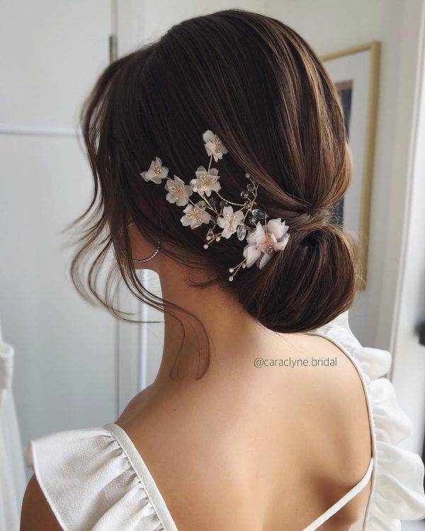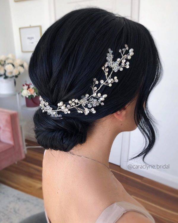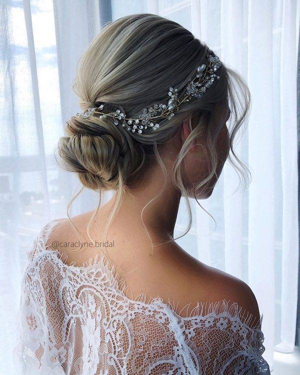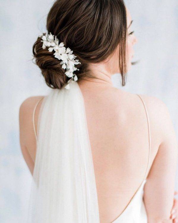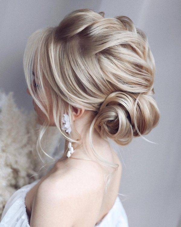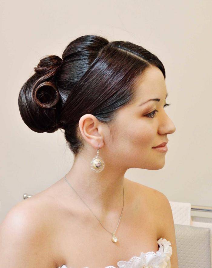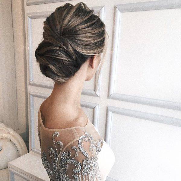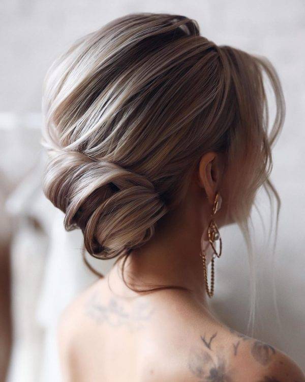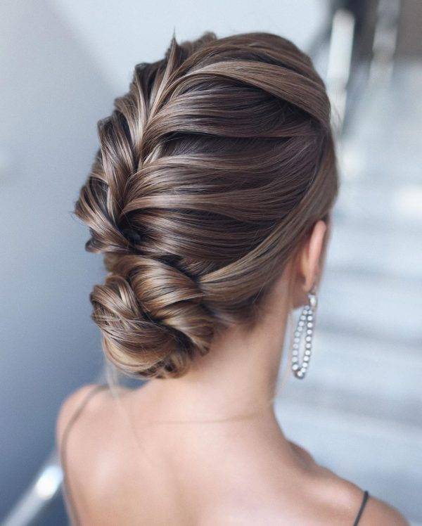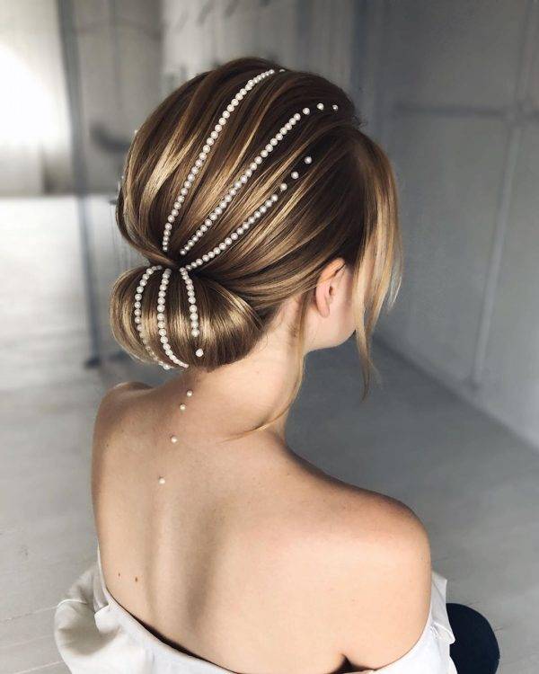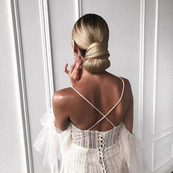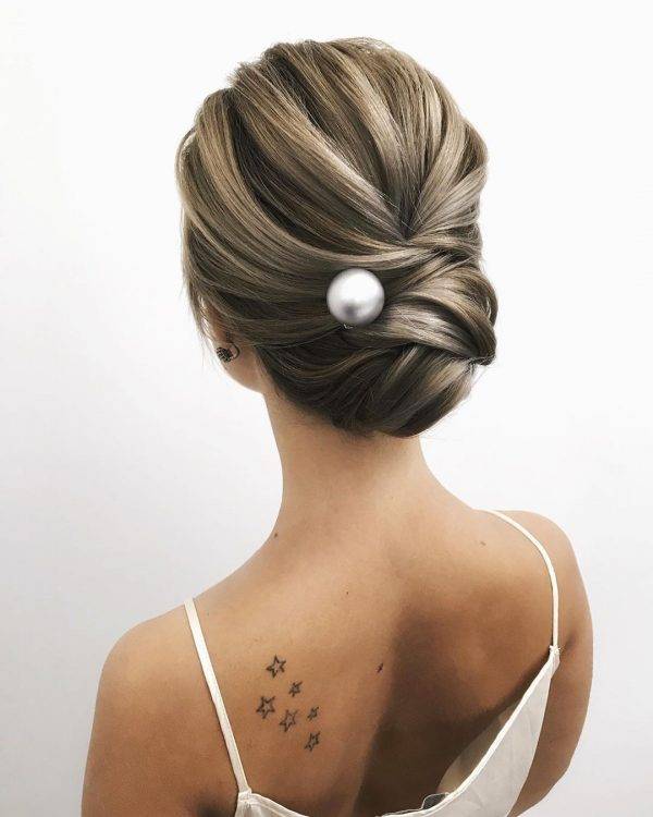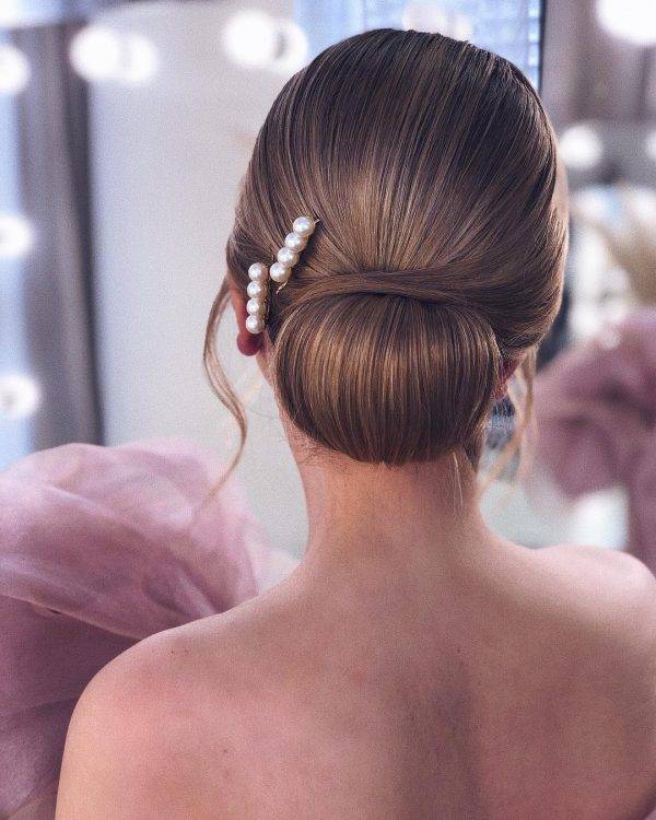 Элегантность и минимализм во всем создают идеальный тандем, даже в женских прическах. Актуальными свадебными прическами в этом стиле будут низкие гладкие пучки. Подобные прически к сожалению, подходят не всем невестам, так как в этом варианте главный акцент падает на черты лица.