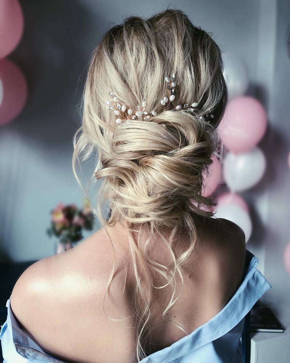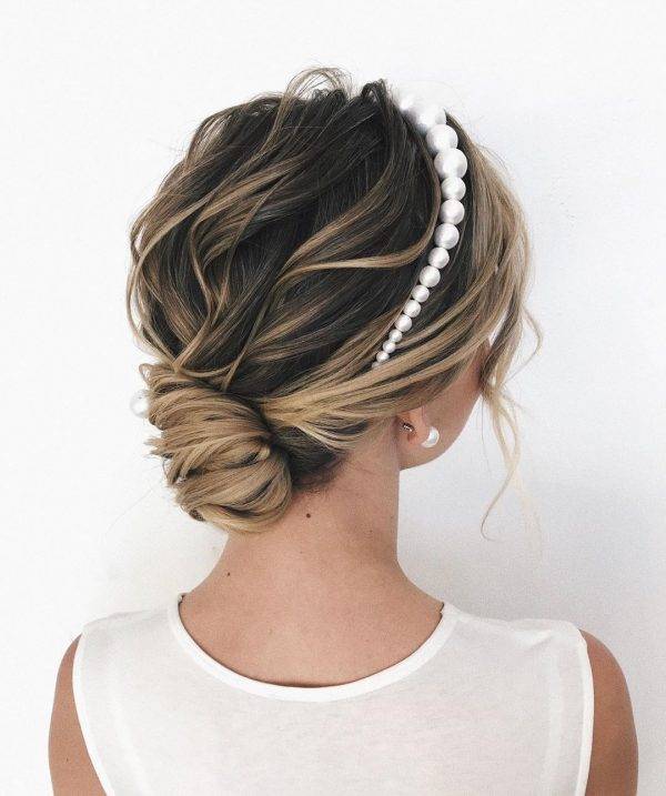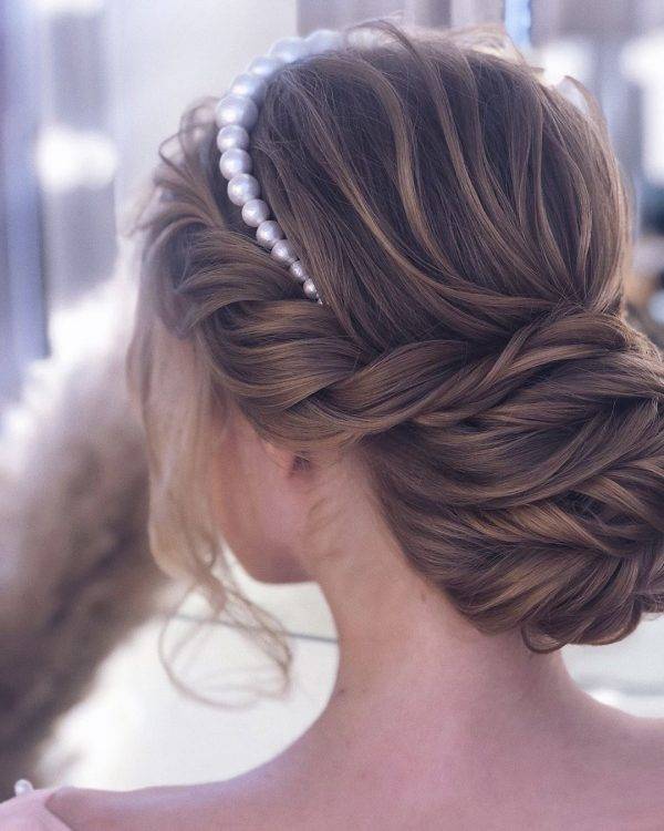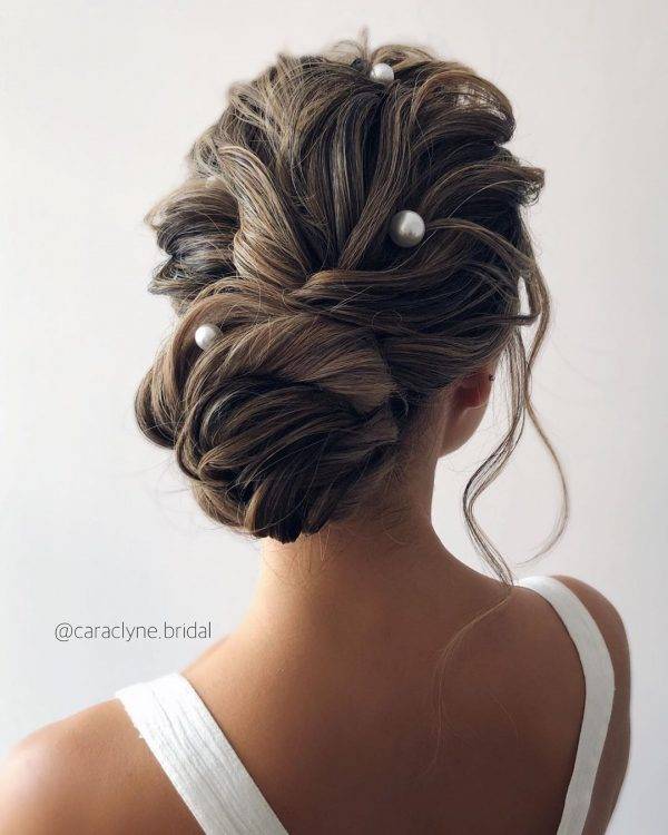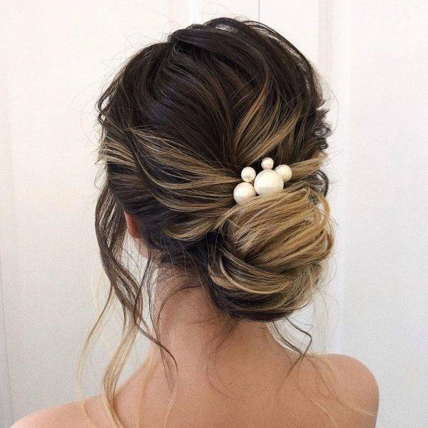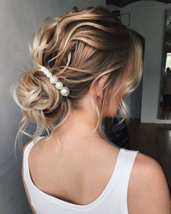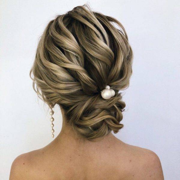 Длинные локоны можно красиво уложить в объемный пучок, добавить несколько выпущенных прядок и украсить жемчугом.