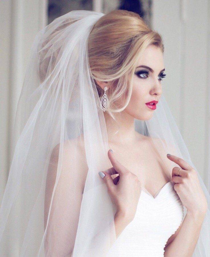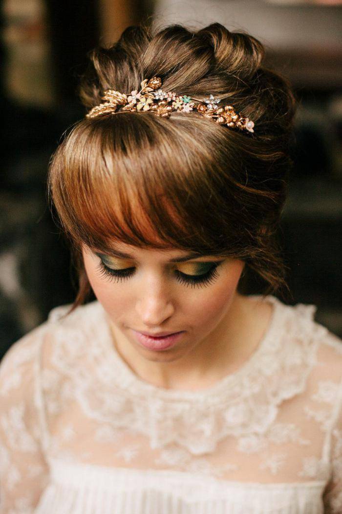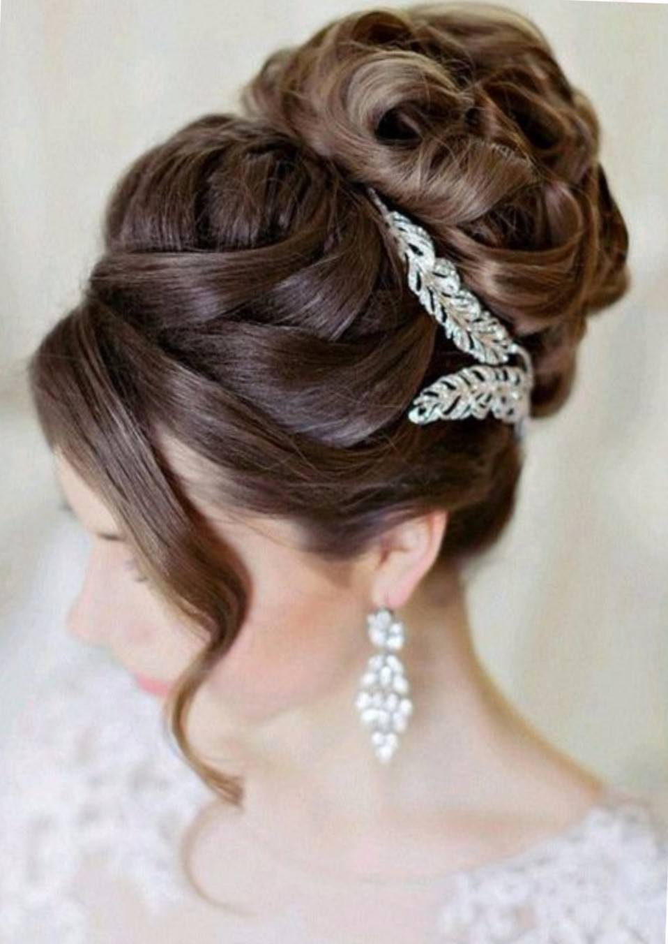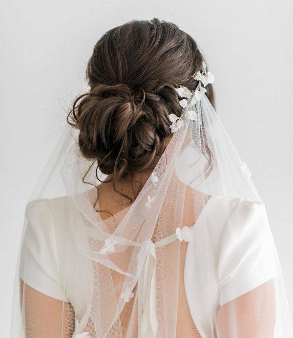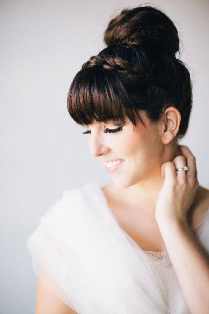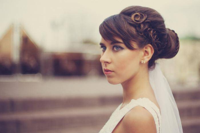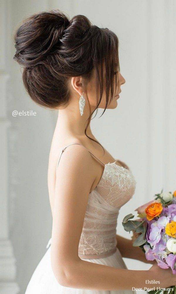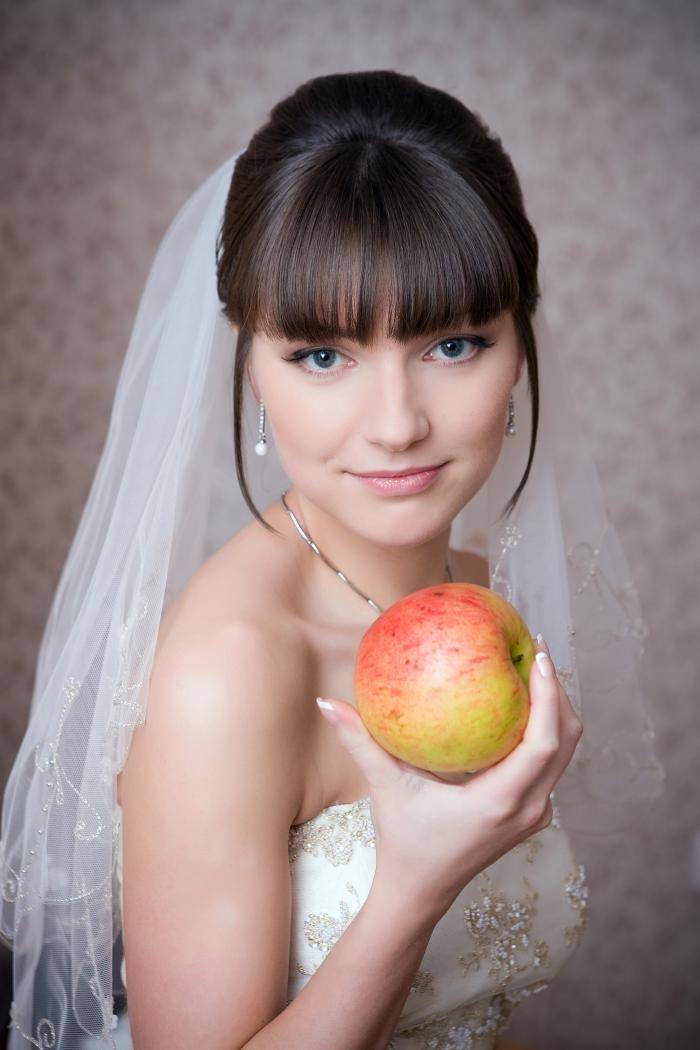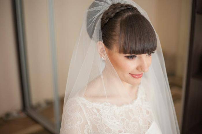 Если Вы намерены использовать в свадебной прическе фату, то самым гармоничным сочетанием станет объемный высокий пучок. Чаще всего, воздушный пучок создают из локонов, выпускают несколько тонких прядок и оставляют длинную слегка подкрученную челку.