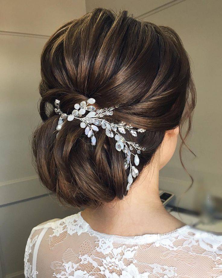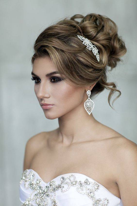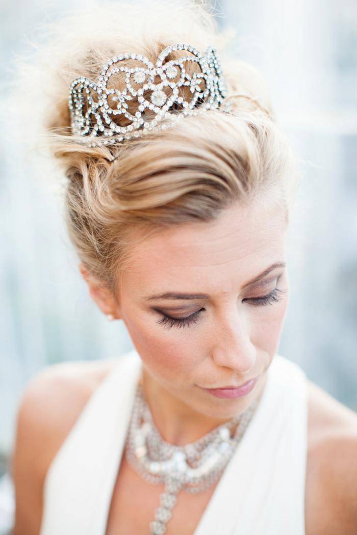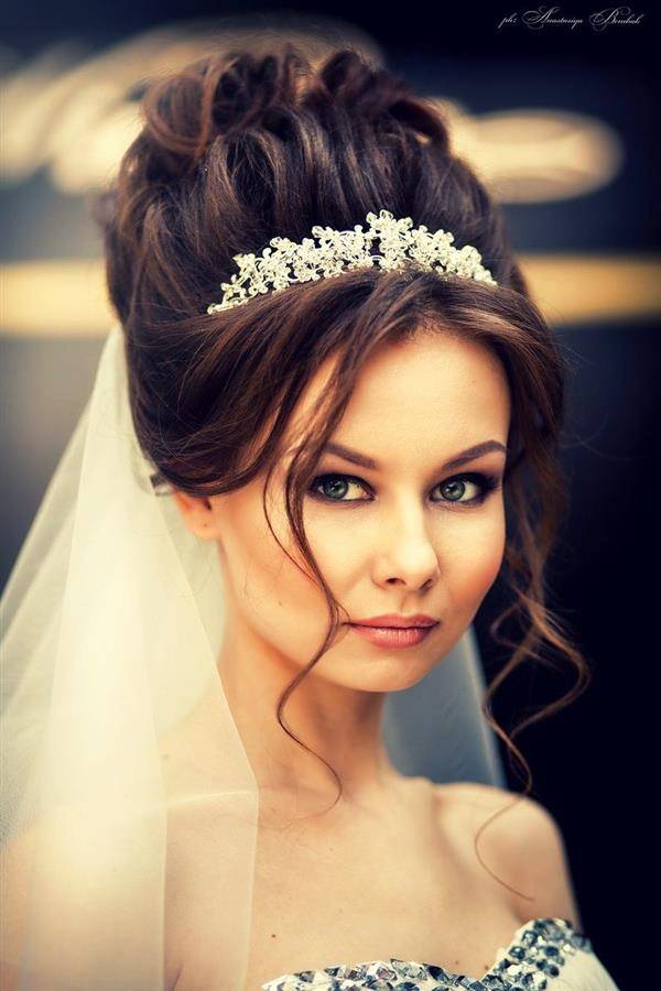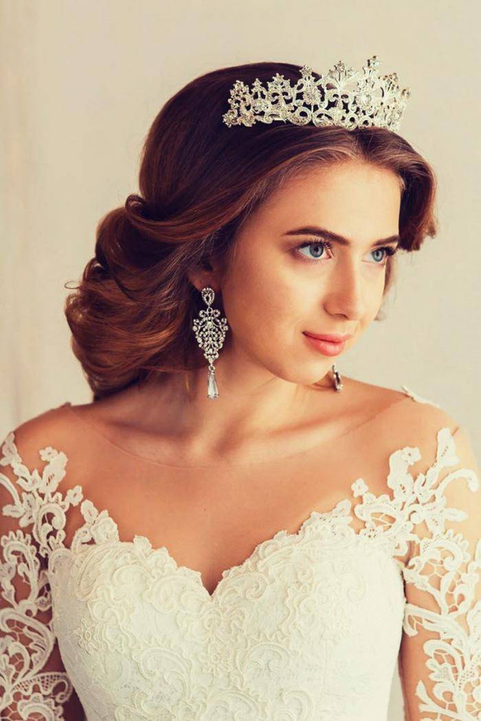 Подобные прически смогут превратить любую невесту в настоящую королеву. Аксессуар сам по себе красив и величествен. Даже самая скромная прическа будет выглядеть очень стильно. Корона сочетается с объемными укладками, с кудрями или с легкими волнами. Также она может украсить косы или классическую ракушку.