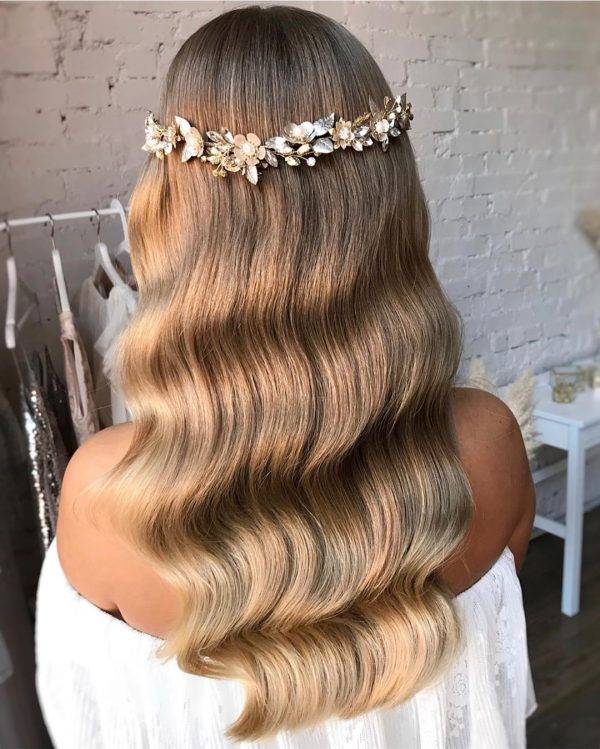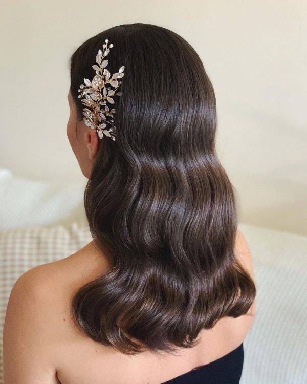 Простая на первый взгляд прическа, которую чаще можно было увидеть у звезд на красной дорожке, стала очень популярной свадебной укладкой 2024-2025. Речь идет о гладких волосах, уложенных волной. Красивая свадебная прическа с голливудскими локонами смотрится великолепно и очень женственно. Фата здесь не самый удачный аксессуар, зато лаконичный веночек, ободок или красивая заколка сбоку помогут сделать свадебную прическу эффектной и оригинальной.