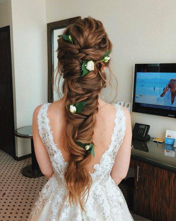Шикарно на обладательницах длинных волос будет смотреться свадебная греческая коса. В новом сезоне подобные прически на свадьбу невесте модно украшать живыми цветочками или роскошными украшениями в виде цепочки или шпилек с жемчужинами.