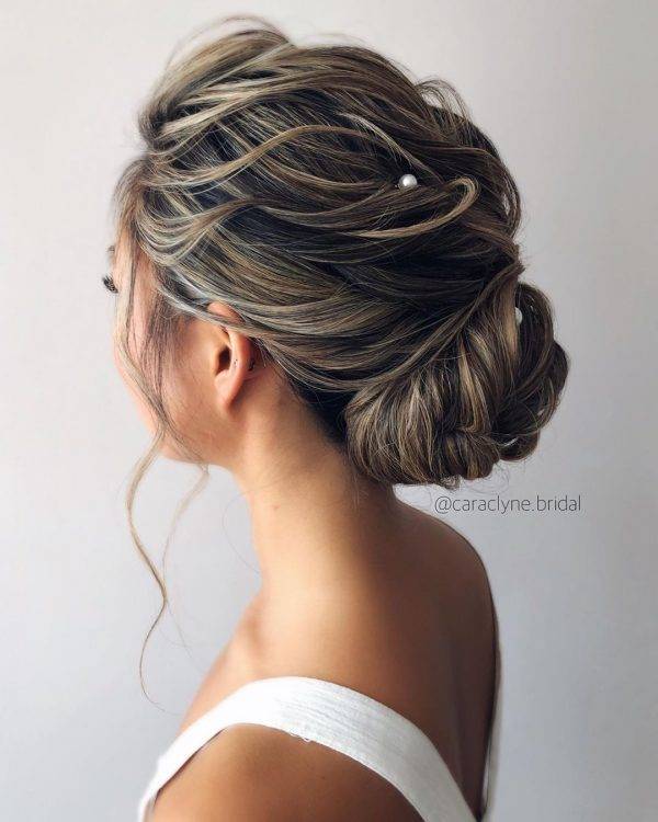 Более игровой и пышной свадебная прическа будет смотреться в виде текстурного пучка. В подобном варианте уместными будут выпущенные прядки, а сама прическа может состоять из текстурных локонов, красиво уложенных в низкий пучок.