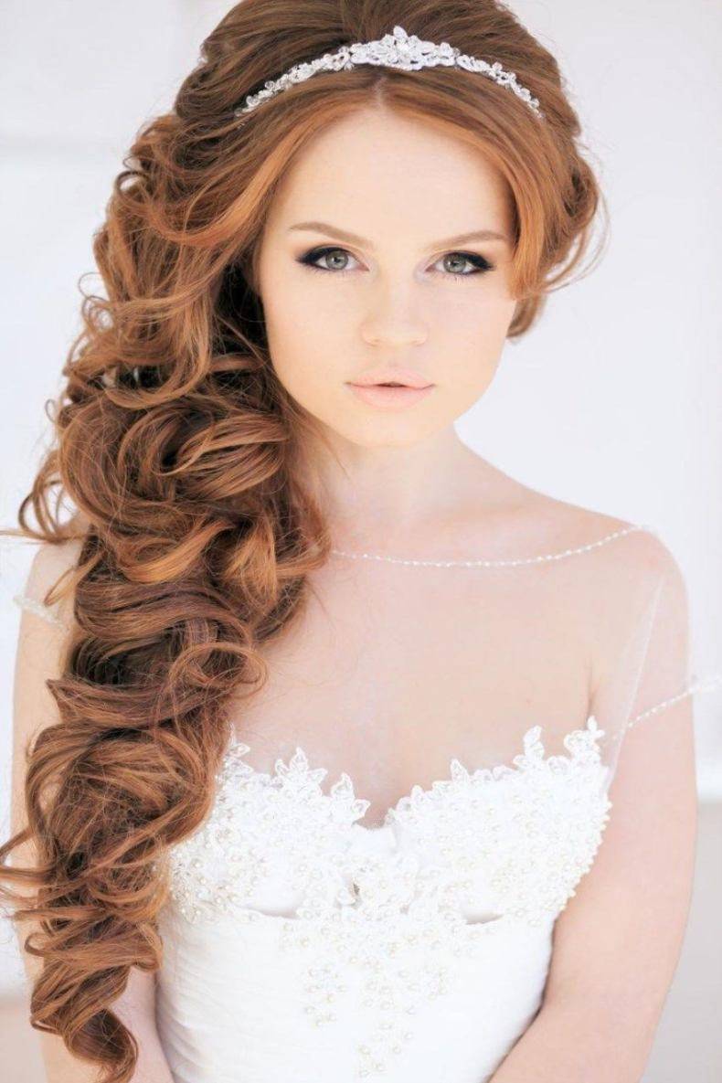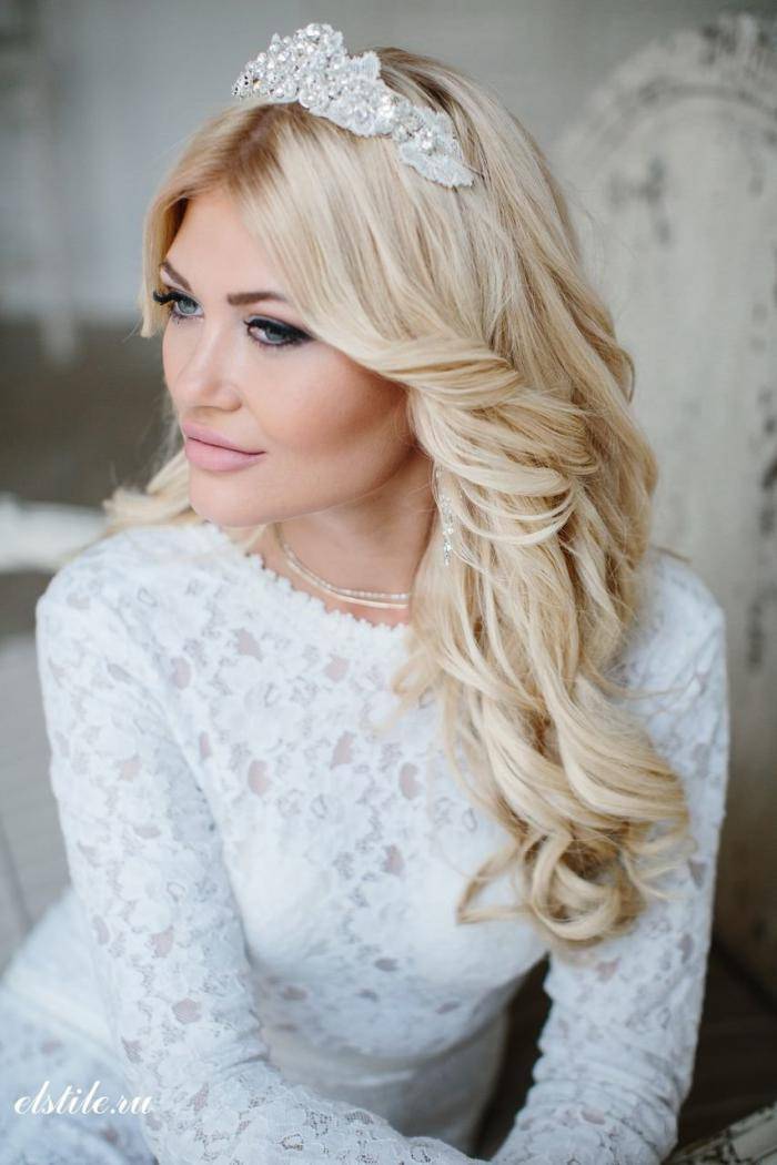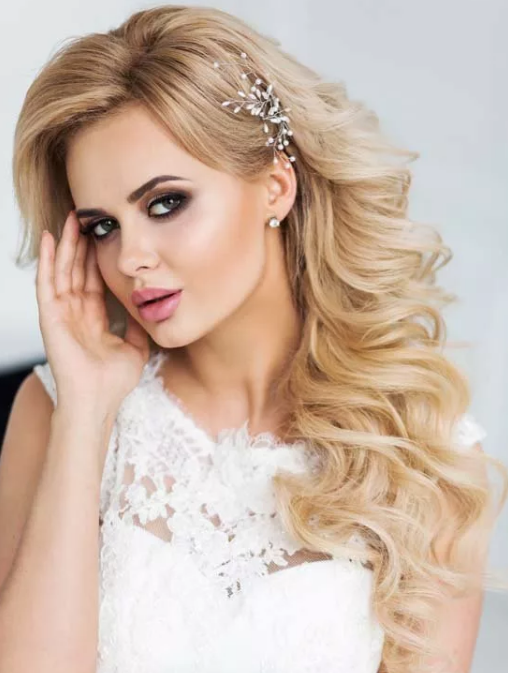 - Прически с легкими и воздушными локонами. Естественная красота распущенных волос – излюбленный выбор голливудских звезд. Подчеркнуть великолепие невесты помогут уложенные на одну сторону локоны или волосы, небрежно собранные на затылке. Можно использовать разнообразные аксессуары: обручи, заколки, диадемы и др.