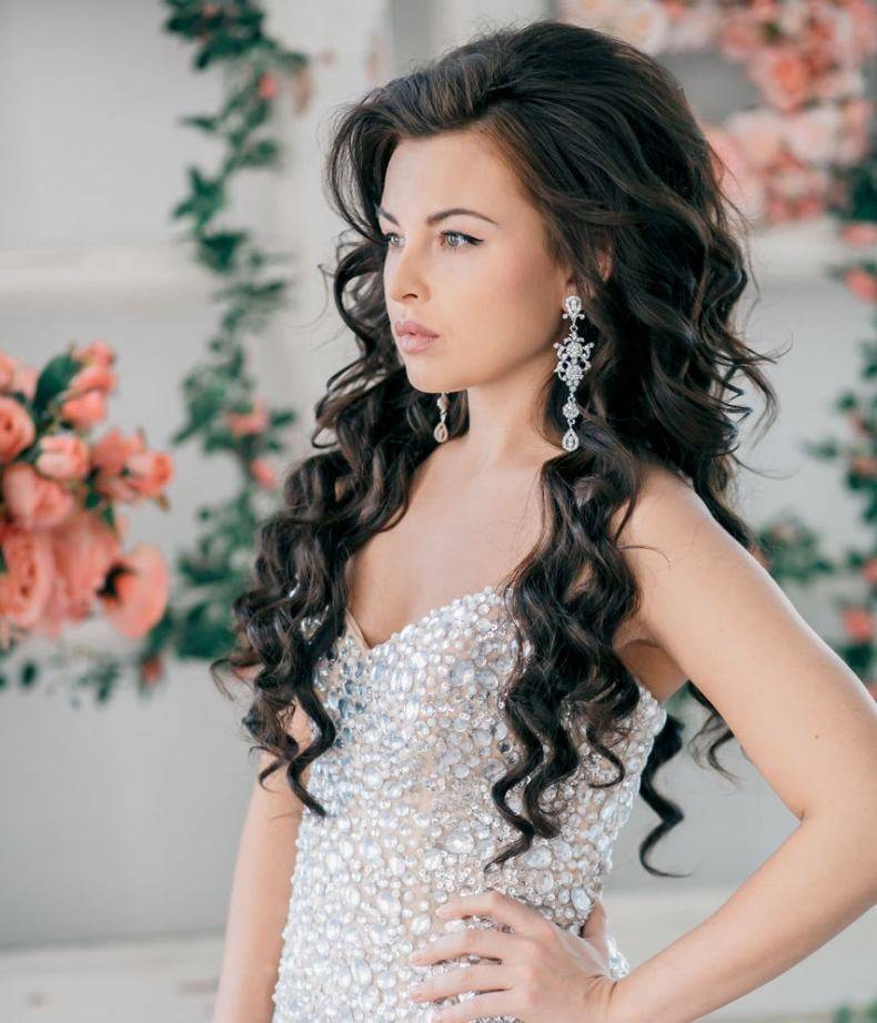 - распущенные длинные волосы, подвитые в крупные легкие локоны, на косой или прямой пробор. Ниспадая на спину и плечи, они превосходно смягчают облик, придают нежность, элегантность;