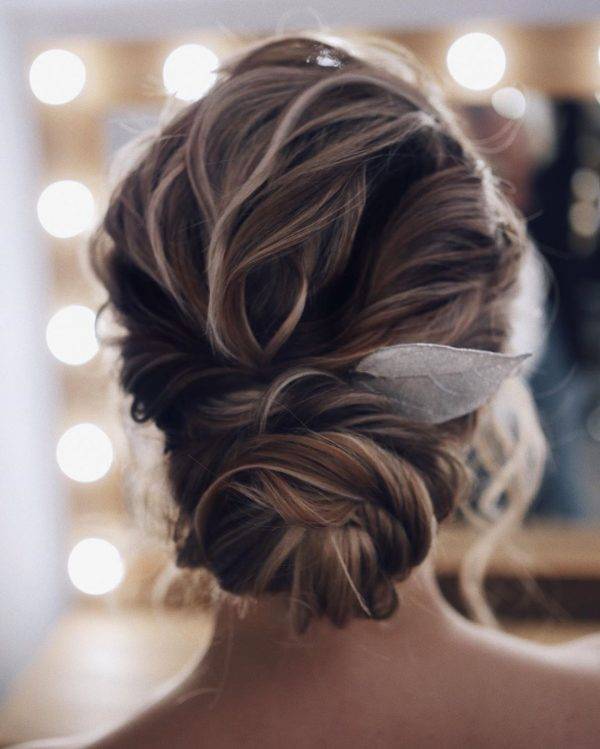 - Воздушный пучок. Идеальный тандем простоты и легкости. Нарочито небрежная укладка с локонами, выпущенными в районе лица, позволит невесте выглядеть сногсшибательно и оставаться в тренде. К тому же, сделать как низкий, так и высокий пучок своими руками достаточно просто.