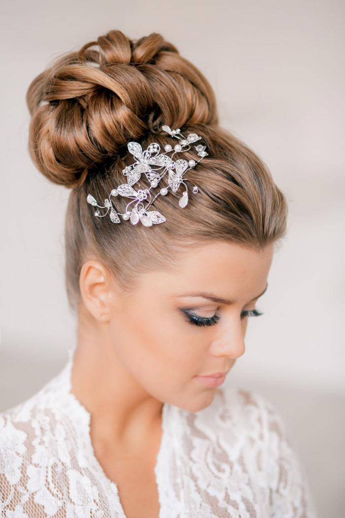 - Пучок. Он великолепно смотрится как с аксессуарами, так и сам по себе. Именно к нему идеально крепится фата – главный атрибут невесты.