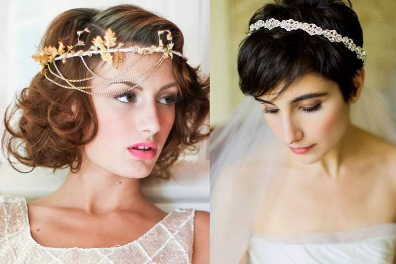 Свадебные прически на короткие волосы с диадемой могут обрести выразительность, а могут и полностью испортить облик невесты. Чтобы последнего не произошло, откажитесь от крупных аксессуаров. Ваш выбор – узкие «цельнолитые» обручи, невесомые цепочки и частично пропадающие среди прядей фероньерки.