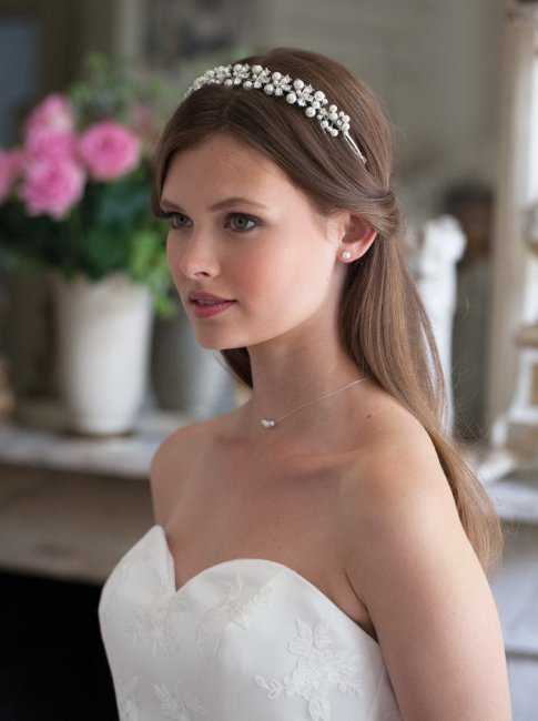 - а с узким лицом лучше всего смотрится жемчужный тонкий ободок, который сделает красивый акцент на волосах невесты.