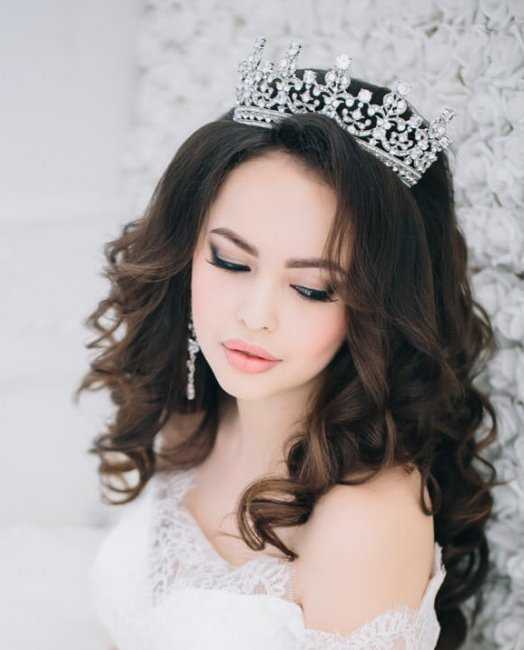 Вьющиеся или завитые волосы — лучший вариант для диадемы. Уложенные вокруг головы струящиеся локоны или коса из них станут замечательной основой для Вашего украшения. Стоит учитывать и густоту волос: так, на тонких и негустых волосах лучше будет выглядеть изящный узкий ободок, чем громоздкая корона.