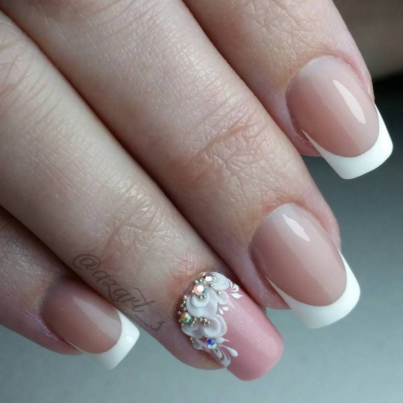На средних и длинных ногтях с французской основой в пастельной цветовой гамме или модном стиле нюд отлично смотрятся камушки, на коротких не стоит злоупотреблять наличием блестящих декоративных деталей – лучше один-два стразика и красивая роспись.