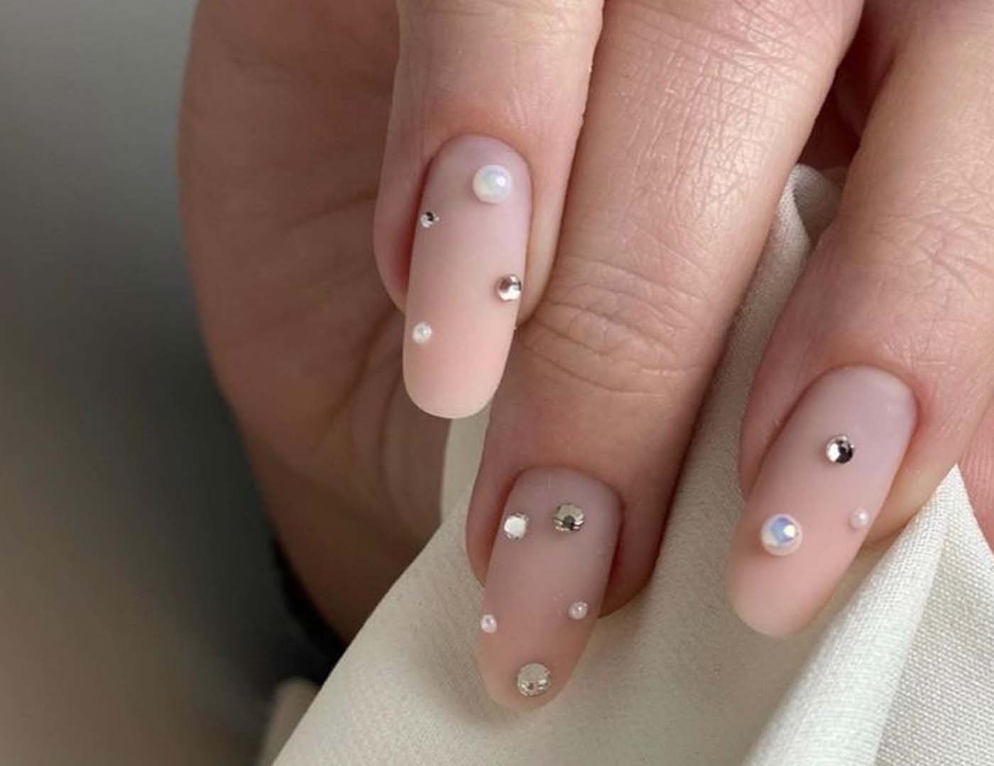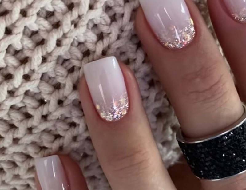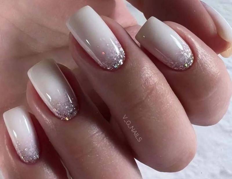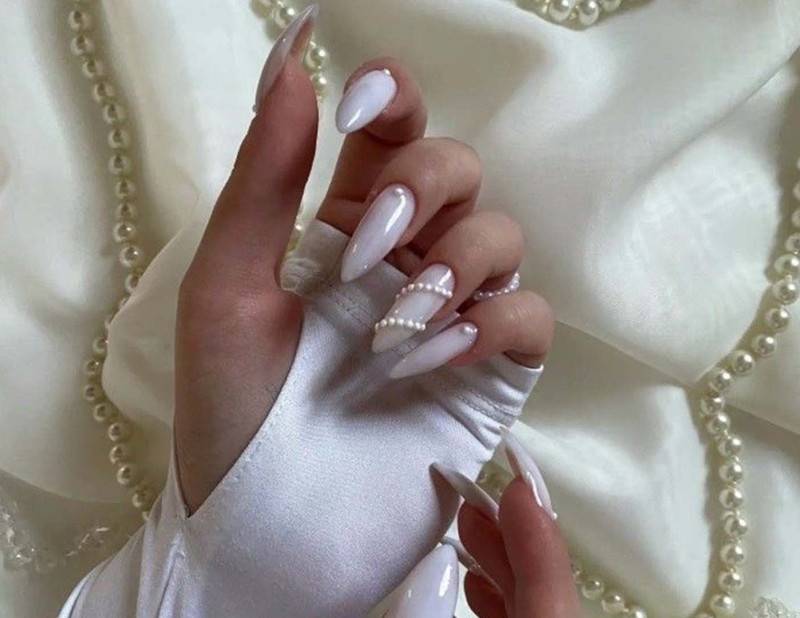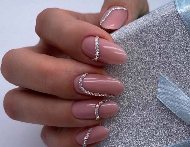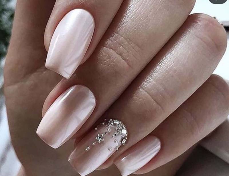 Свадебный маникюр со стразами всегда выглядит празднично и нарядно. Для дизайна можно выбрать россыпь страз или жемчуга на ногтях. Также этот декор можно расположить или в зону кутикулы, или в зону френча. Конечно же свадьба — это блеск, поэтому можно воспользоваться моментом и выложить блёстки в зоне кутикулы, перекрыв всё молочным гелем. Это, пожалуй, самый трендовый дизайн, который можно применить и в маникюр на свадьбу 2023.