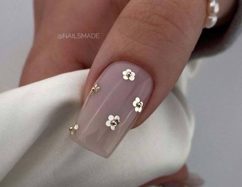Даже если пространство ногтевой пластины позволяет, не стоит размещать на ногтях слишком объемный декор. Такие, пусть даже эффектные, ноготки попросту будут мешаться во время торжества, цепляться за волосы и свадебное платье. Небольших цветов в прикорневой зоне будет достаточно, чтобы показать очаровательный и красивый вид ноготков.