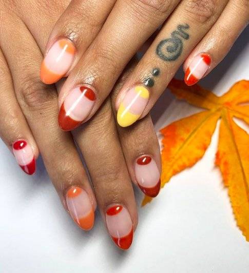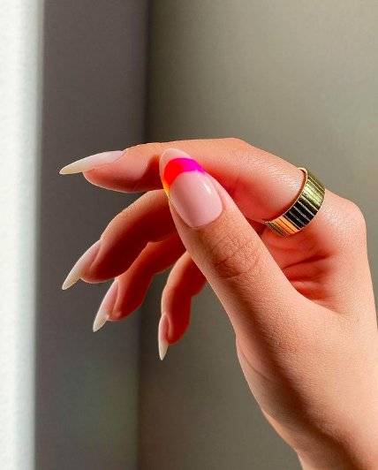 При создании френча на длинных миндалевидных ногтях можно наслаивать полосы разных цветов друг на друга внахлест и получить яркий цветной французский маникюр, который станет заметной деталью образа.