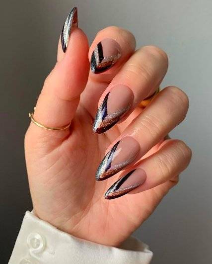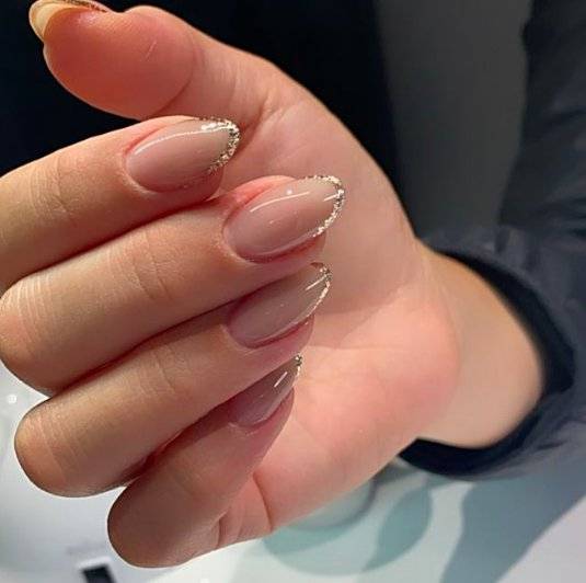 - сочетанием френча и маникюра в стиле Диор на бежевом фоне (верх ногтя покрывается черным, ложе прорезывается золотым глиттером).