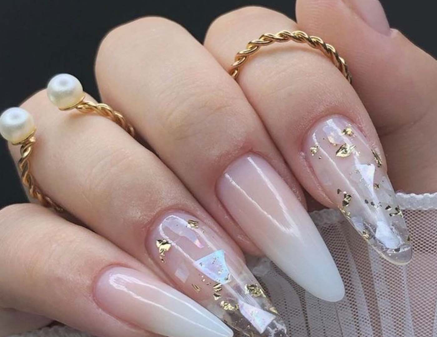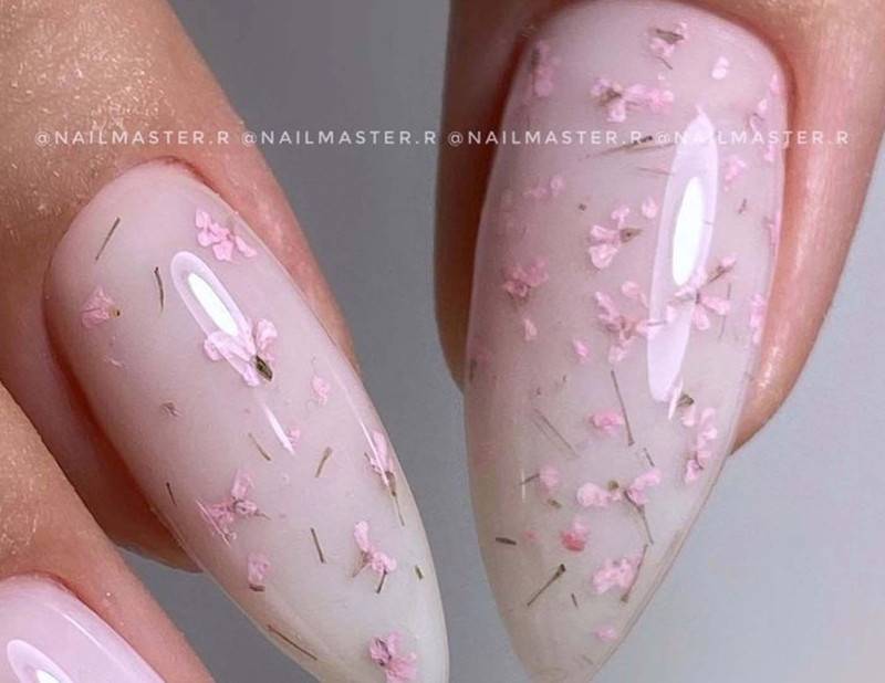 Кусочки потали, выложенные сверху покрытия или наоборот, положенные внутри, как никогда выигрышно смотрятся на свадебных ногтях. Поталь бывает в разных оттенках: серебро, золото, медь. Поэтому можно подобрать под любую стилистику свадьбы. Если свадьба будет проходить в цветочных композициях, то можно невесте предложить использовать для декора свадебного маникюра сухоцветы. Они бывают самых разнообразных цветов и прекрасно сочетаются с кусочкам потали.