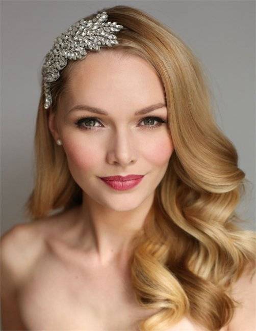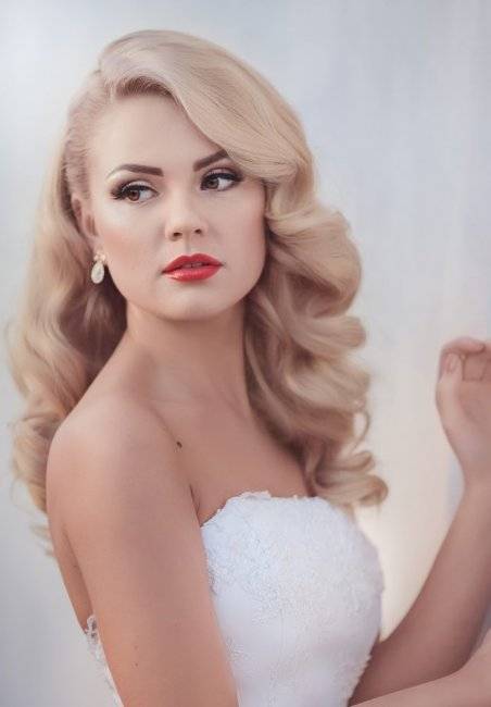 Для губ подойдёт алый или розовый оттенок помады. Макияж должен подчёркивать глубину голубых глаз невесты, заставляя их сверкать.