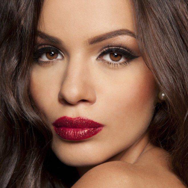 Яркий макияж для брюнеток: вишневая помада и глаза подчеркнуты серо-синими оттенками теней.
