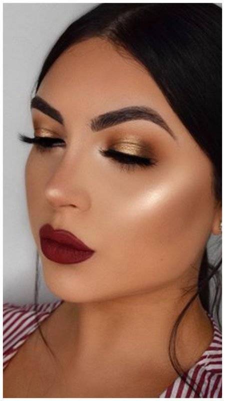 Макияж в золотисто-коричневых оттенках: переход теней от жемчужно-золотых в коричневые, губы оттенка малиновый щербет.