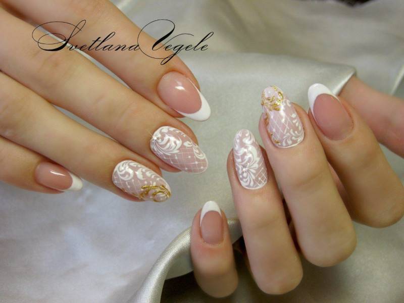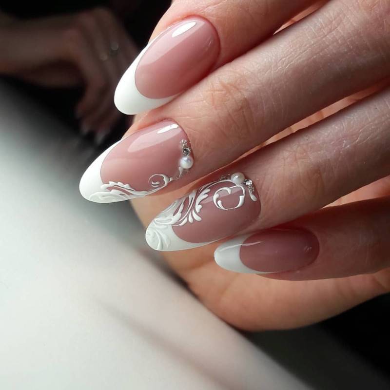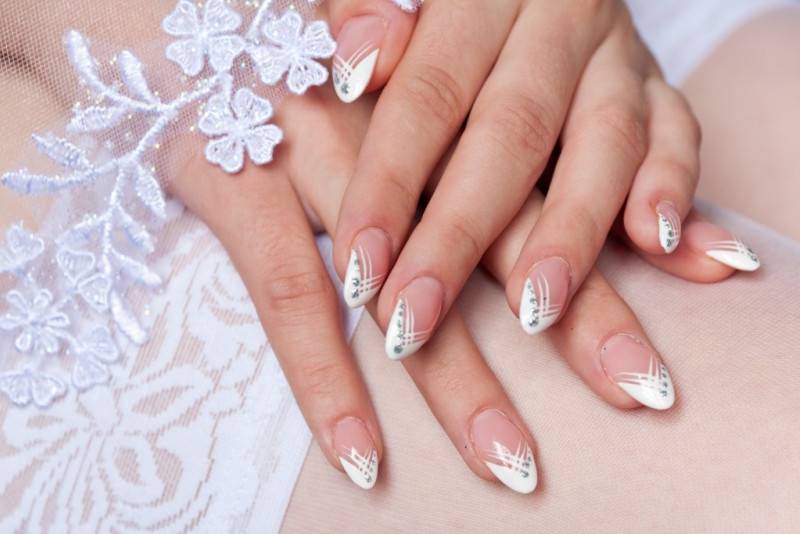 Французский маникюр – отличное решение для свадебного дизайна ногтей. Невесты предпочитают белый пиджак с овальной формой «улыбки» (с нестандартной формой экспериментировать не стоит). В этой технике отлично смотрится ноготь любой формы – квадратный, овальный или миндалевидный. В качестве дополнения к французскому маникюру подойдут стразы, кружевные узоры, вензеля, с помощью которых можно нанести на ноготь инициалы молодоженов.