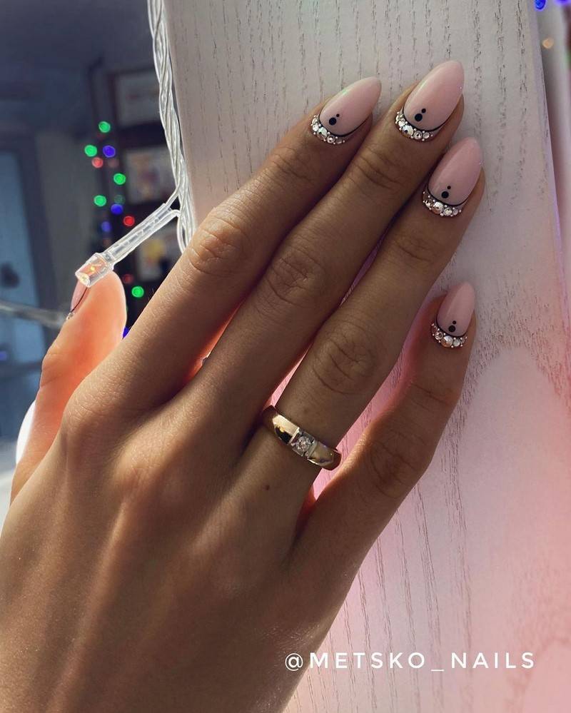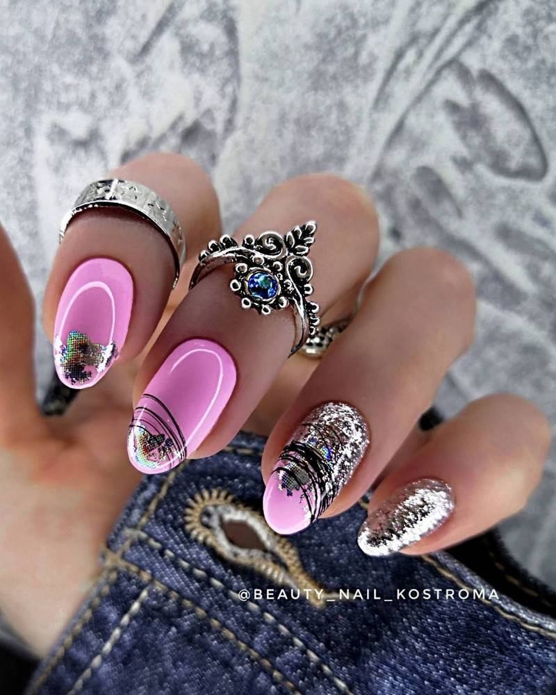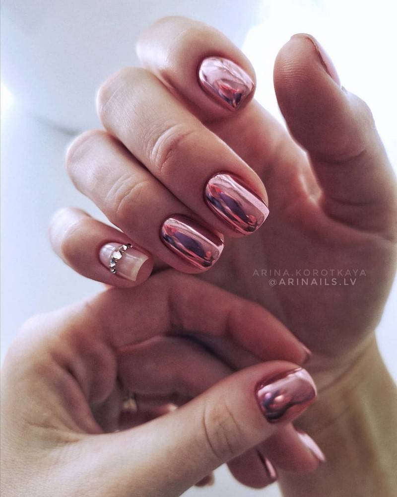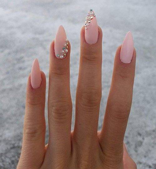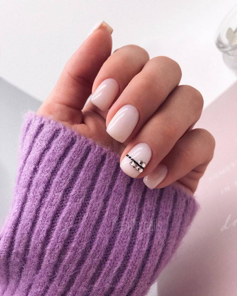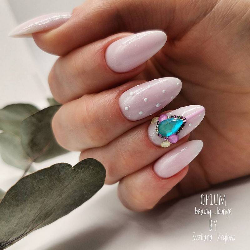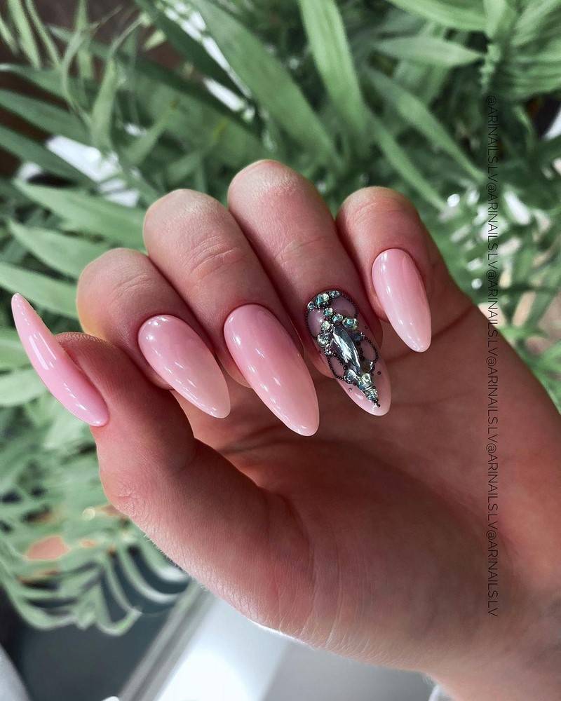 Мотивируя модной в этом сезоне сдержанностью, самые продвинутые дизайнеры советуют не перегружать розовый маникюр декором, а разместить его только на безымянном пальце.