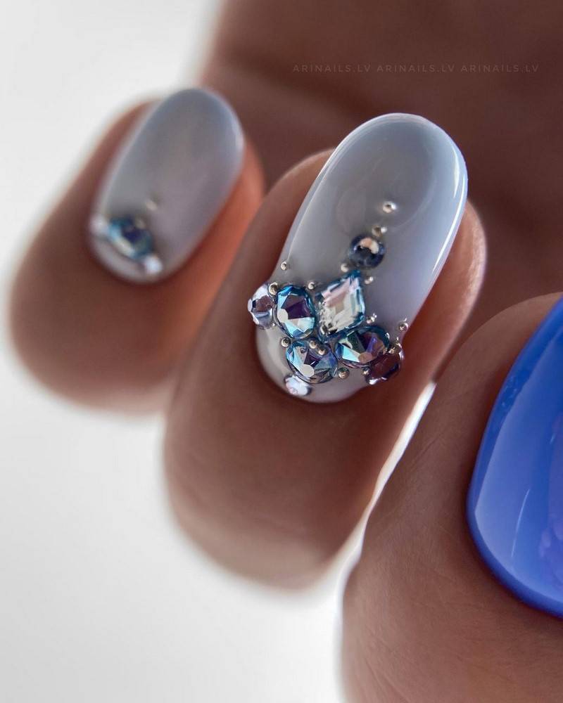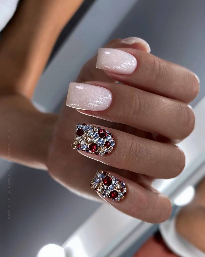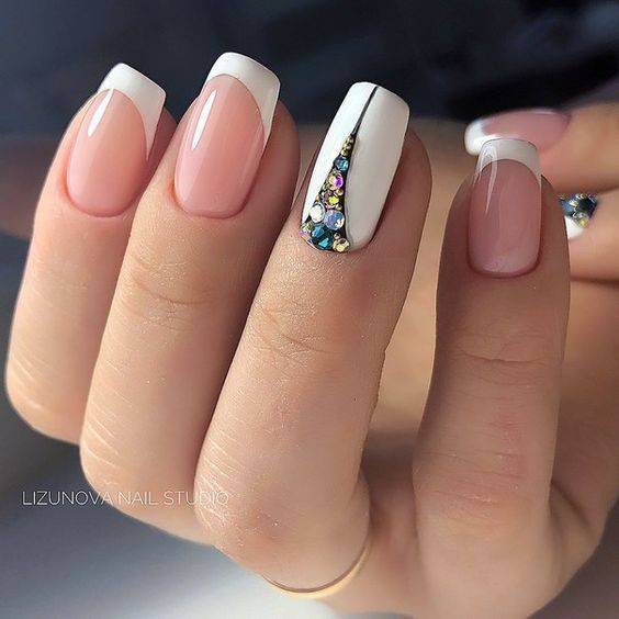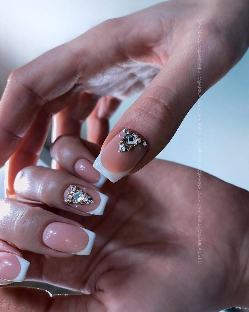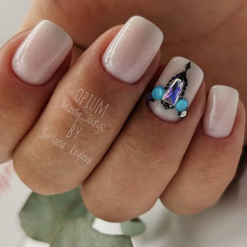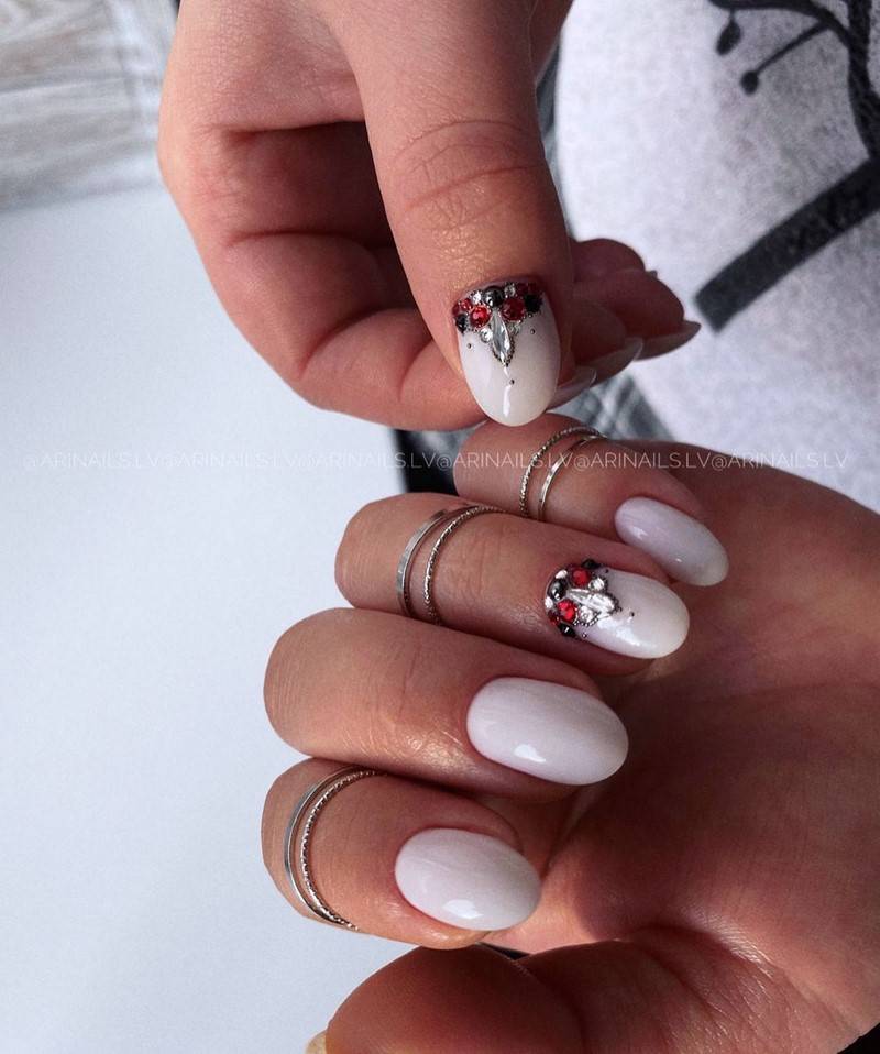 Очень элегантно смотрятся стразы на безымянном пальце, где будет красоваться обручальное кольцо. Также можно подчеркнуть большой палец, украсив его крупными декоративными камнями. Горсть маленьких страз на всех пальцах превратит вас в сказочную принцессу и сделает ваш образ неповторимым. Если в день торжественной церемонии вы отдадите предпочтение маникюру других оттенков – не проблема! Камни и стразы выгодно подчеркнут красоту ваших пальцев в пастельной палитре свадебного маникюра.