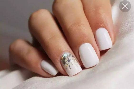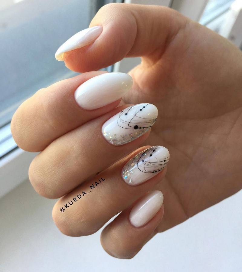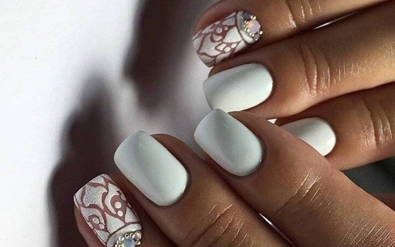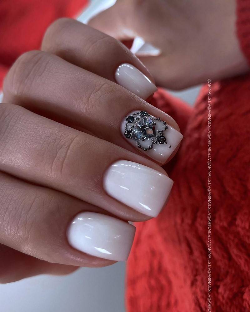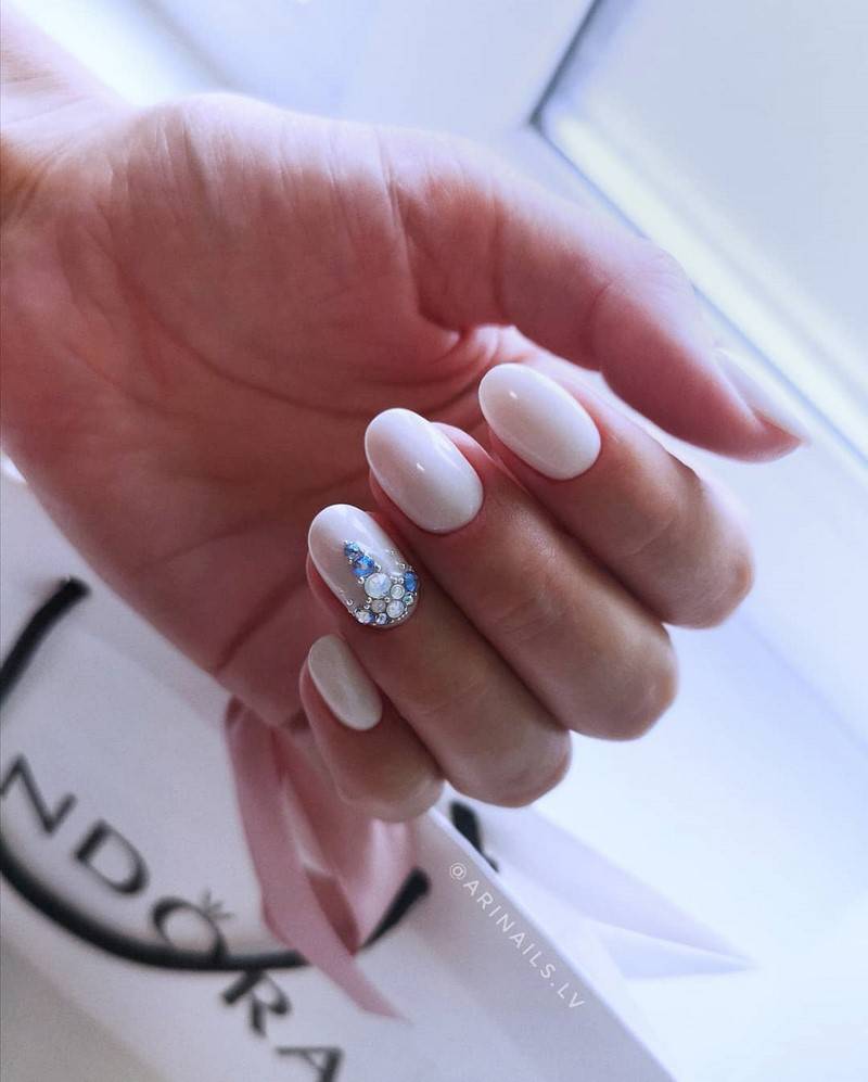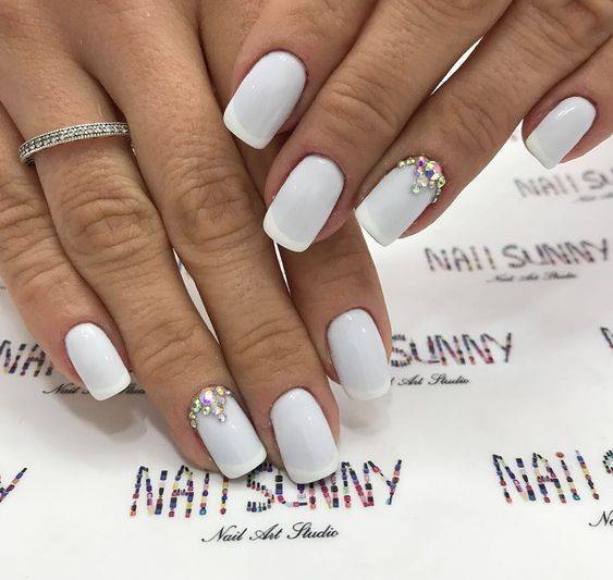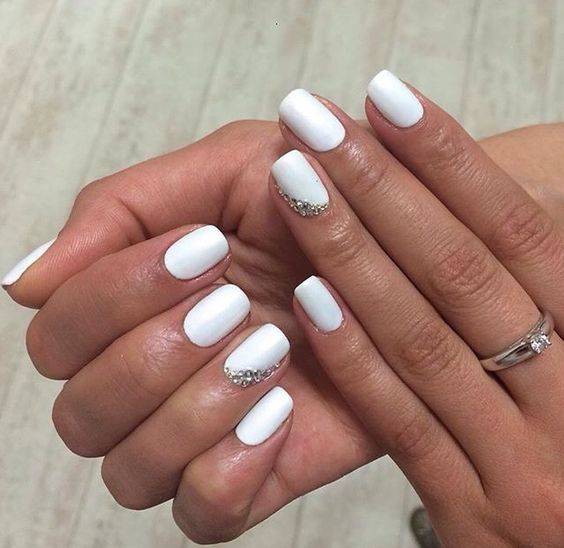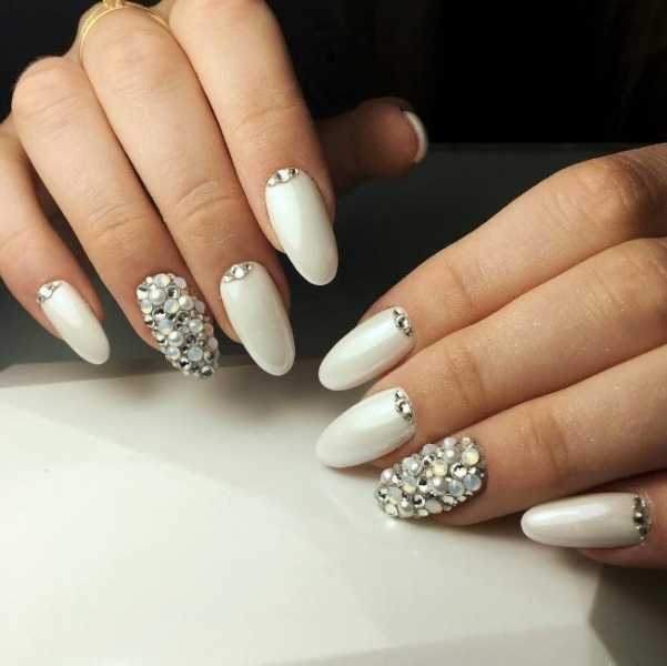 Белоснежные ноготки как нельзя лучше подходят к платью невесты и считаются классикой свадебного нейл-арта. Однако простое белое покрытие уместно только для повседневных и деловых образов, а по случаю свадьбы лучше всего дополнить маникюр ярким и сверкающим декором. Идеальными считаются серебряные или белые кристаллы.