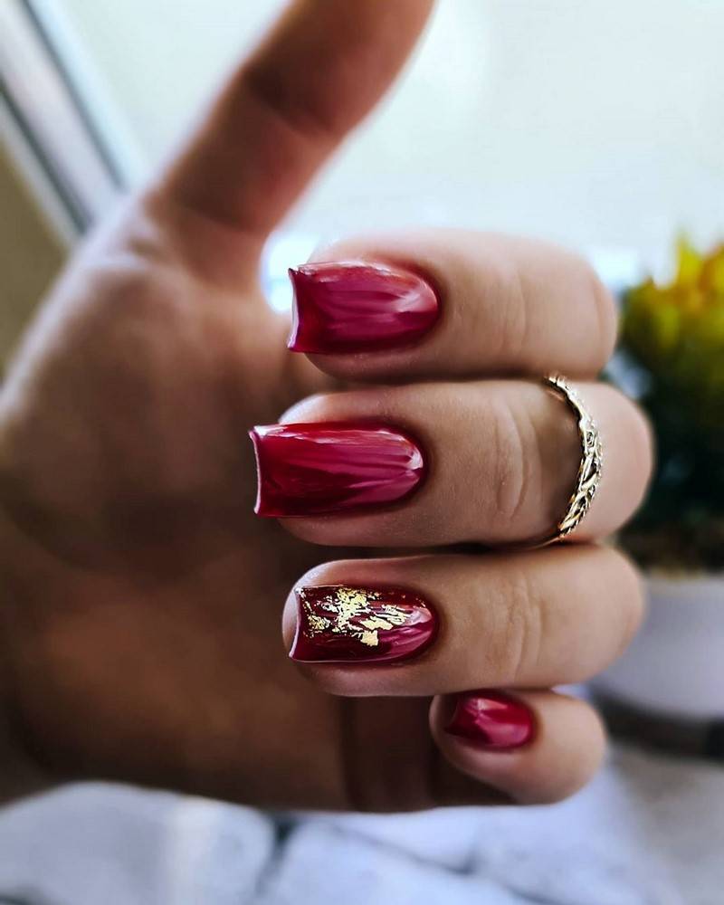 Осенний маникюр 2020 года можно дополнить пенным дизайном ногтей в топовых цветах сезона: бордовый, синий, черный, фиолетовый.