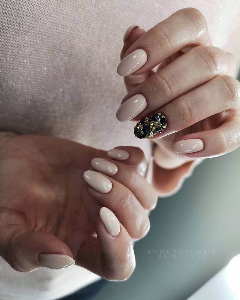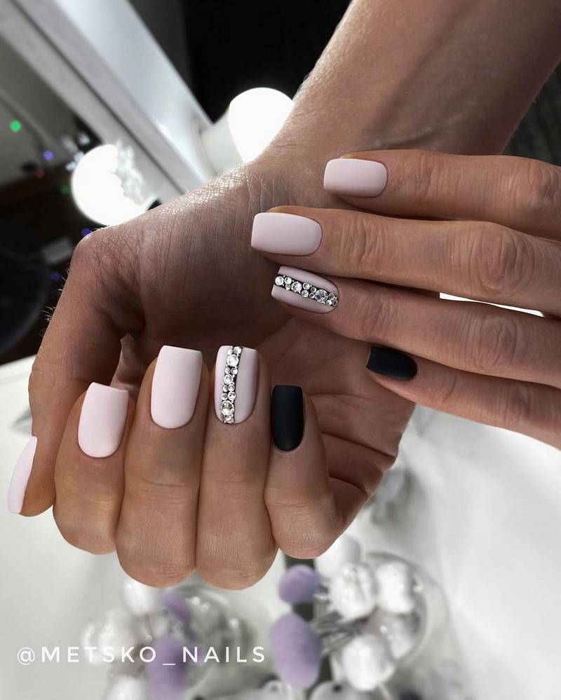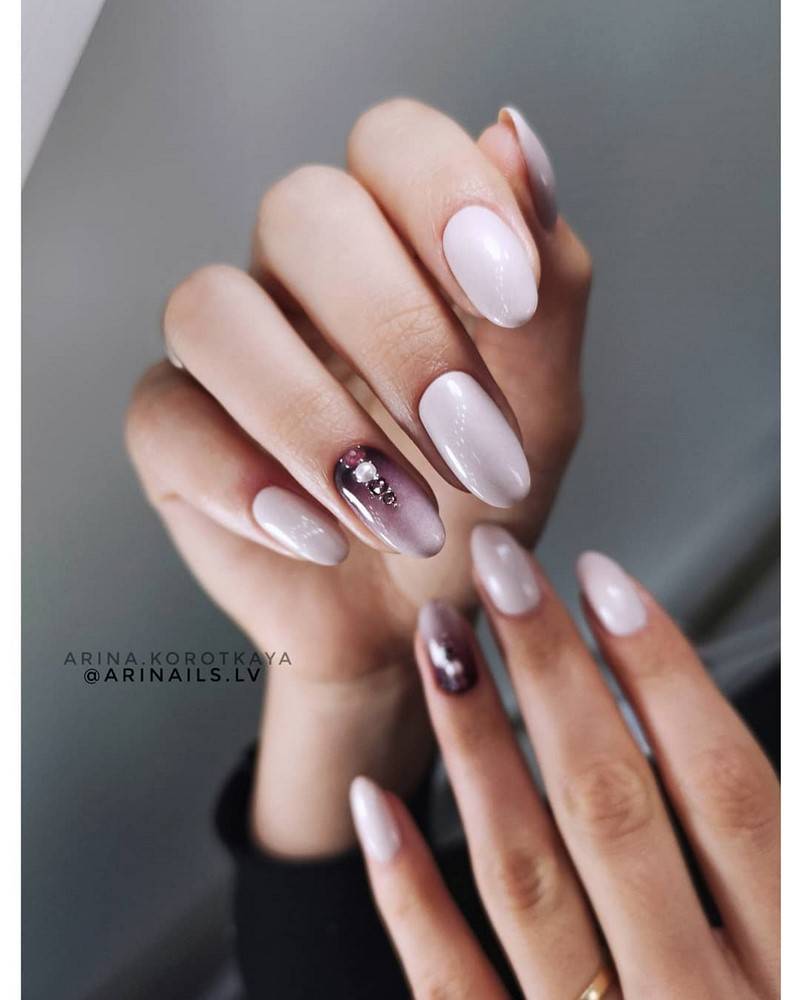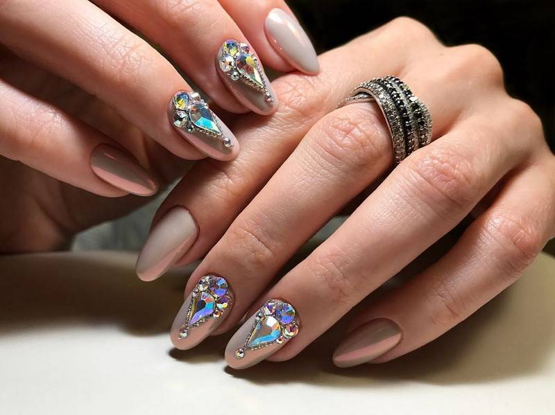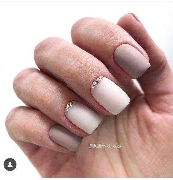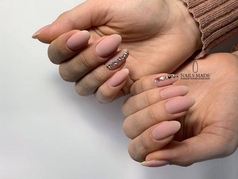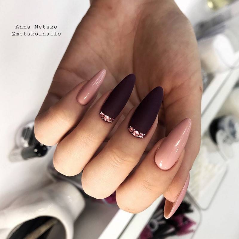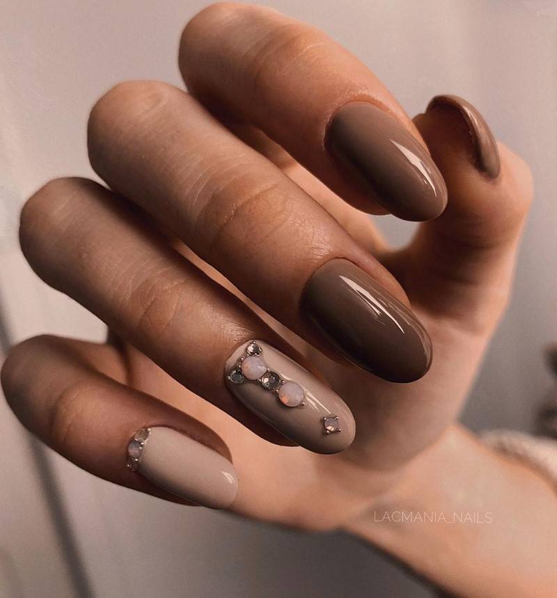 Маникюр с камнями просто шикарно смотрится в матовом исполнении, такой дизайн не оставит равнодушным никого. В осеннем маникюре сезона 2020 камни и стразы наносятся на ногтевую пластину в виде красивого узора на один-два пальца, или в виде мелких камушек на всю ногтевую пластину, тоже в виде акцента. Идеи для вдохновения, смотрите на фото ниже: