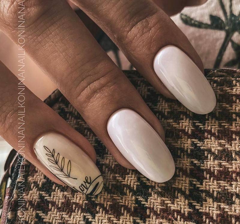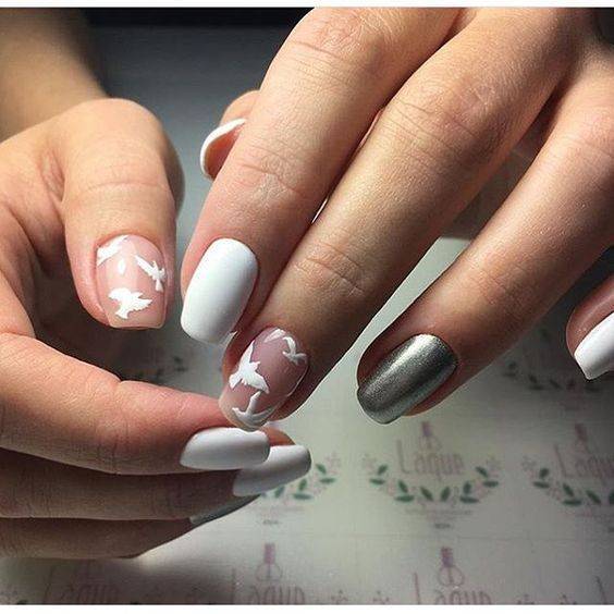 Еще один способ сделать свадебный маникюр красивым – художественная роспись. Наиболее популярными безусловно считаются тематические. Такие как обручальные кольца, сердечки и даже голуби.