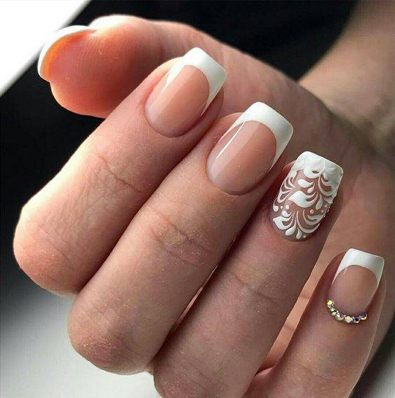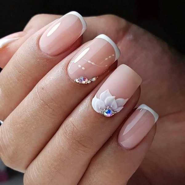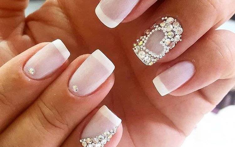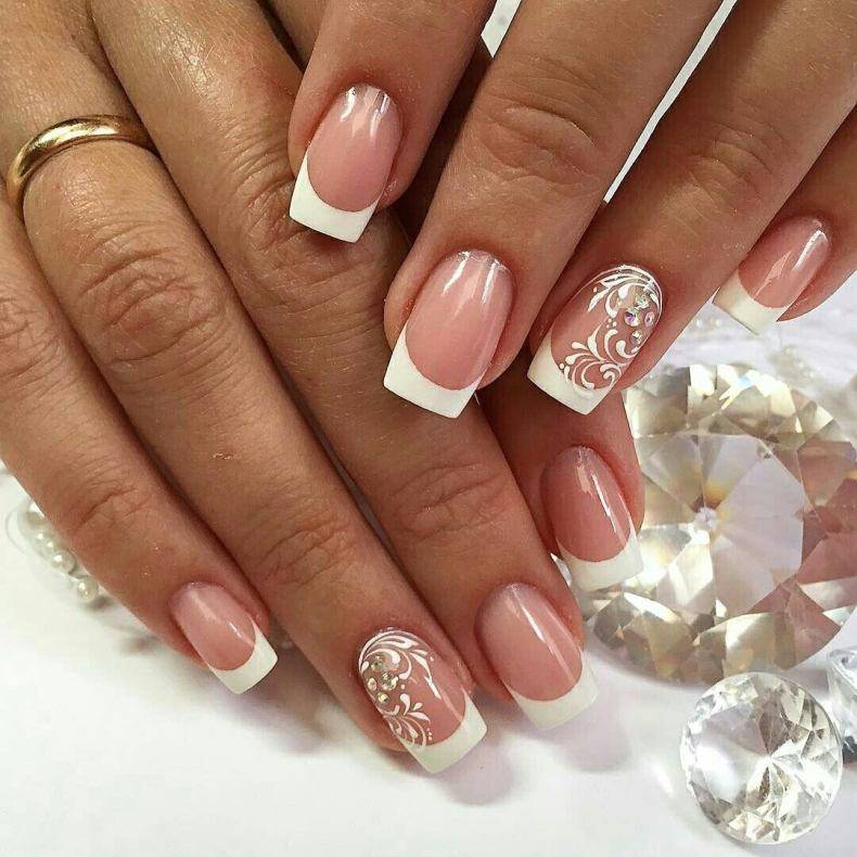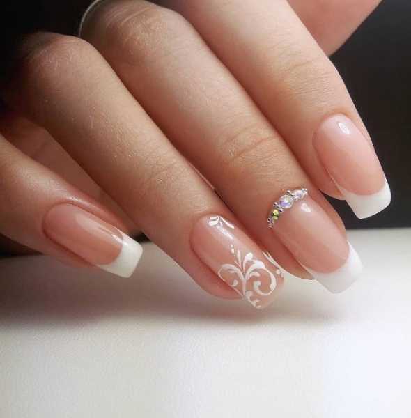 Французский маникюр – отличное решение для свадебного дизайна ногтей. Невесты предпочитают белый пиджак с овальной формой «улыбки» (с нестандартной формой экспериментировать не стоит). В этой технике отлично смотрится ноготь любой формы – квадратный, овальный или миндалевидный. В качестве дополнения к французскому маникюру подойдут стразы, кружевные узоры, вензеля, с помощью которых можно нанести на ноготь инициалы молодоженов.